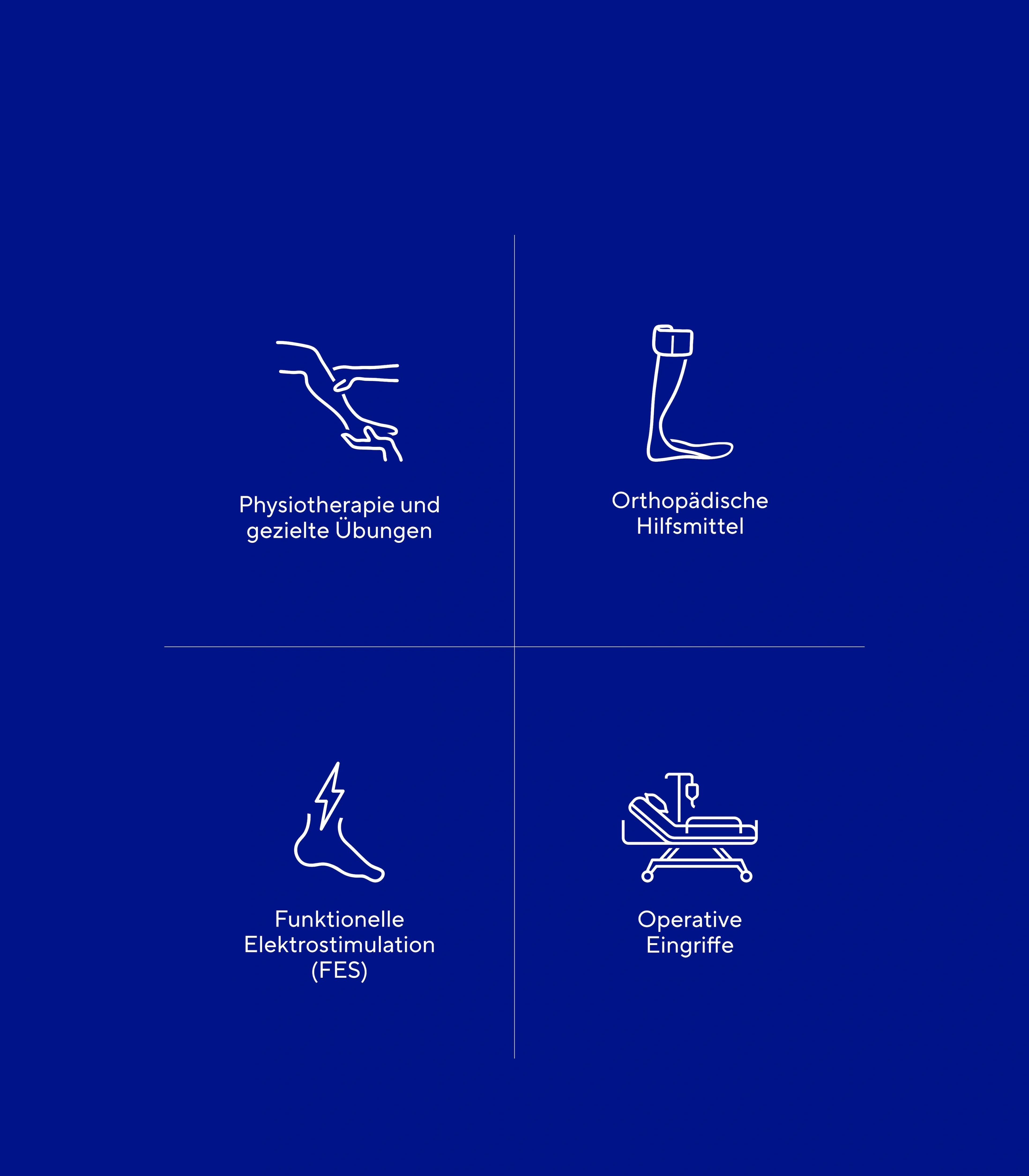 Ihr Physiotherapeut wird Ihnen gezielte Übungen empfehlen, um Ihre Muskulatur zu stärken und Ihr Gangbild zu verbessern. Dazu gehören Übungen zur Anhebung des Fußes, Drehbewegungen sowie das Gehen auf den Fersen. Führen Sie jedoch keine Übungen ohne ärztliche Beratung durch.