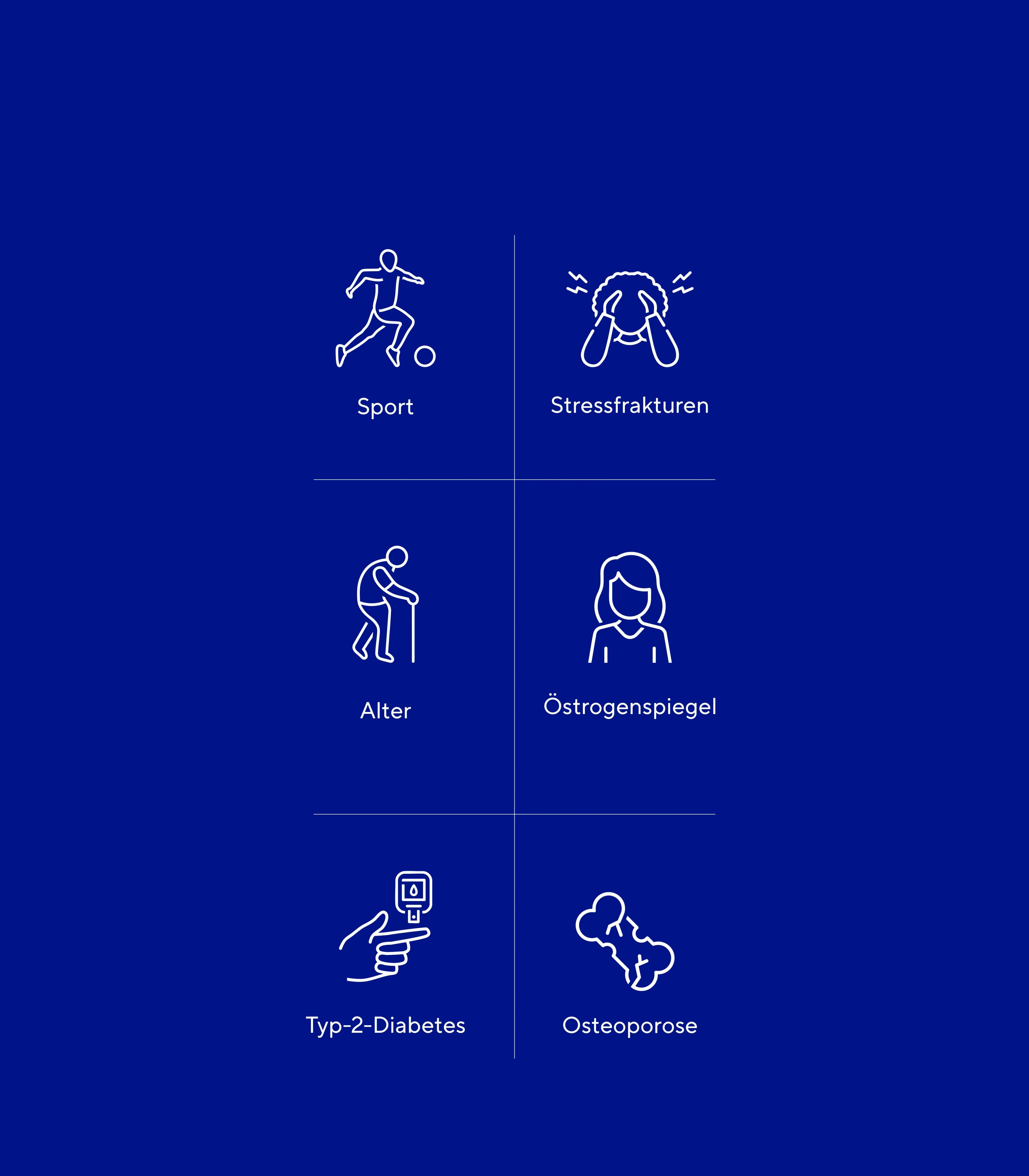 Ermüdungsfrakturen, die durch wiederholte Mikrotraumata entstehen, sind ein häufiges Problem bei Sportlern. Frauen haben ein erhöhtes Risiko, insbesondere solche mit Menstruationsbeschwerden, geringem Körpergewicht oder niedriger Energiezufuhr. Diese Faktoren, manchmal in Verbindung mit einer geringen Knochenmasse, erhöhen die Anfälligkeit für diese Art von Fraktur(10).