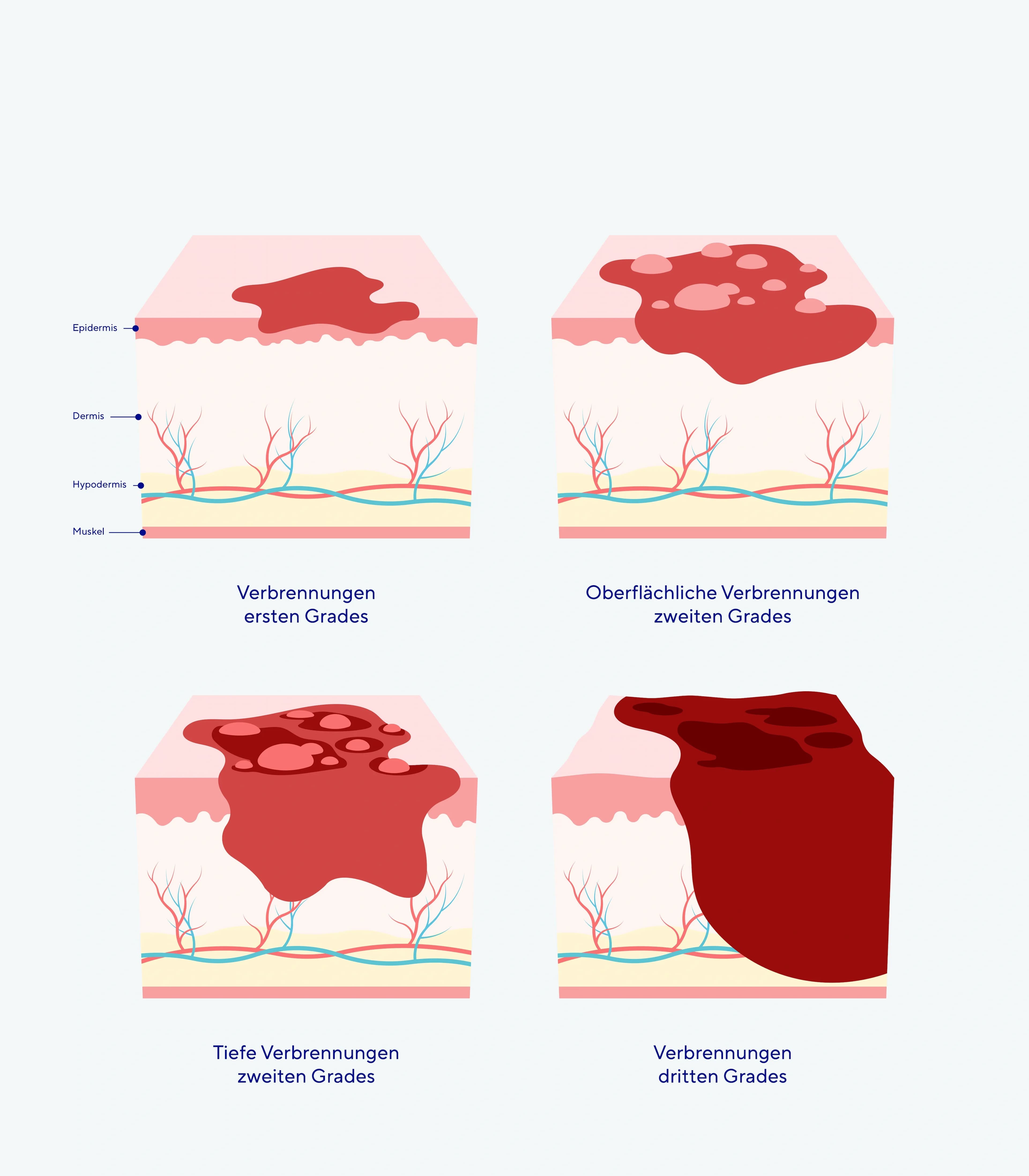 Verbrennungen werden im Allgemeinen nach ihrer Lage, der Größe des betroffenen Bereichs und ihrem Schweregrad klassifiziert. Je nach Tiefe der Verbrennung werden drei Verbrennungsgrade unterschieden: 1., 2. oder 3(4,5).