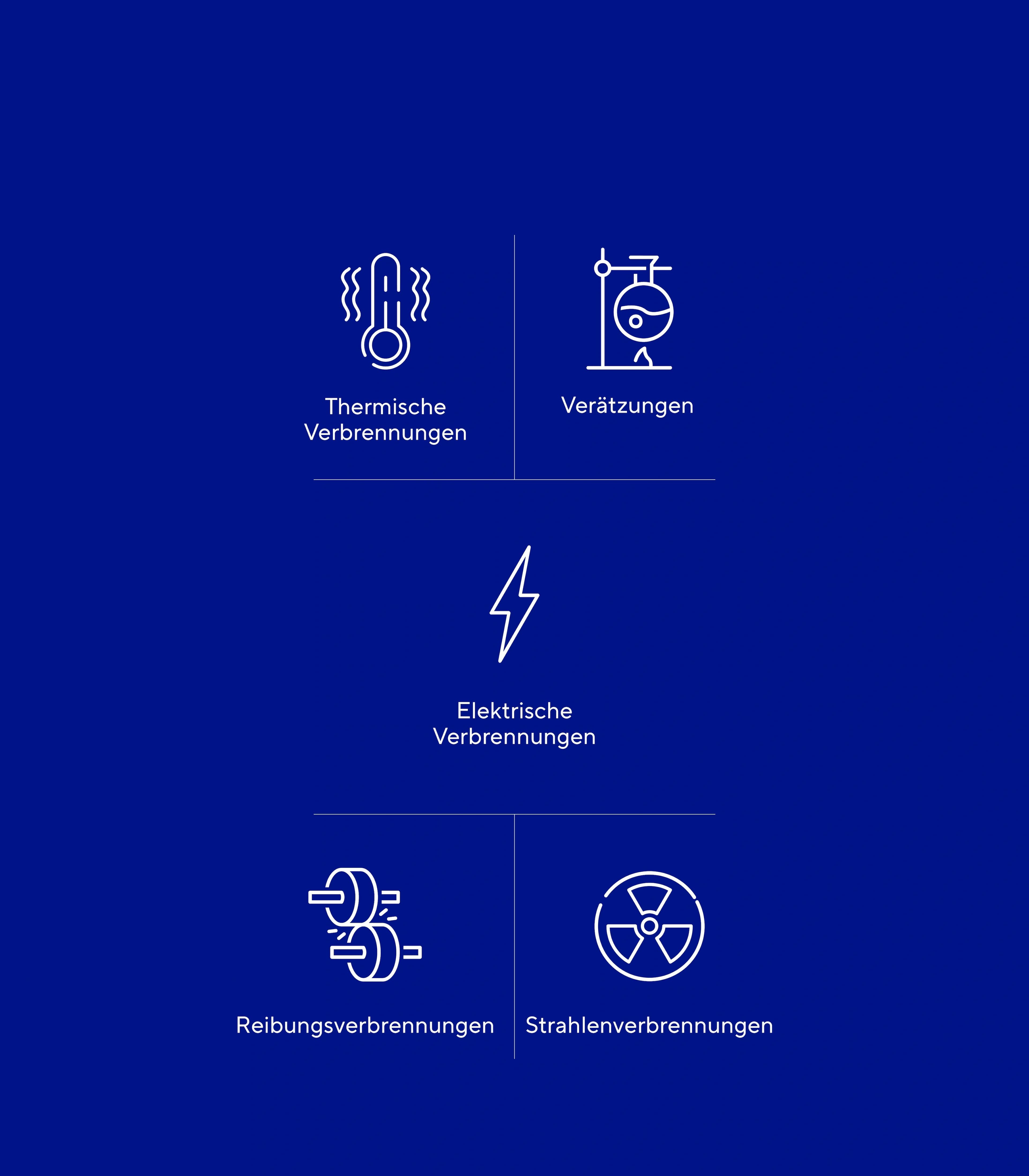 Verbrennungen können durch verschiedene Ursachen entstehen, z. B. durch Hitze, Chemikalien, Elektrizität, Reibung oder Strahlung(2,4):