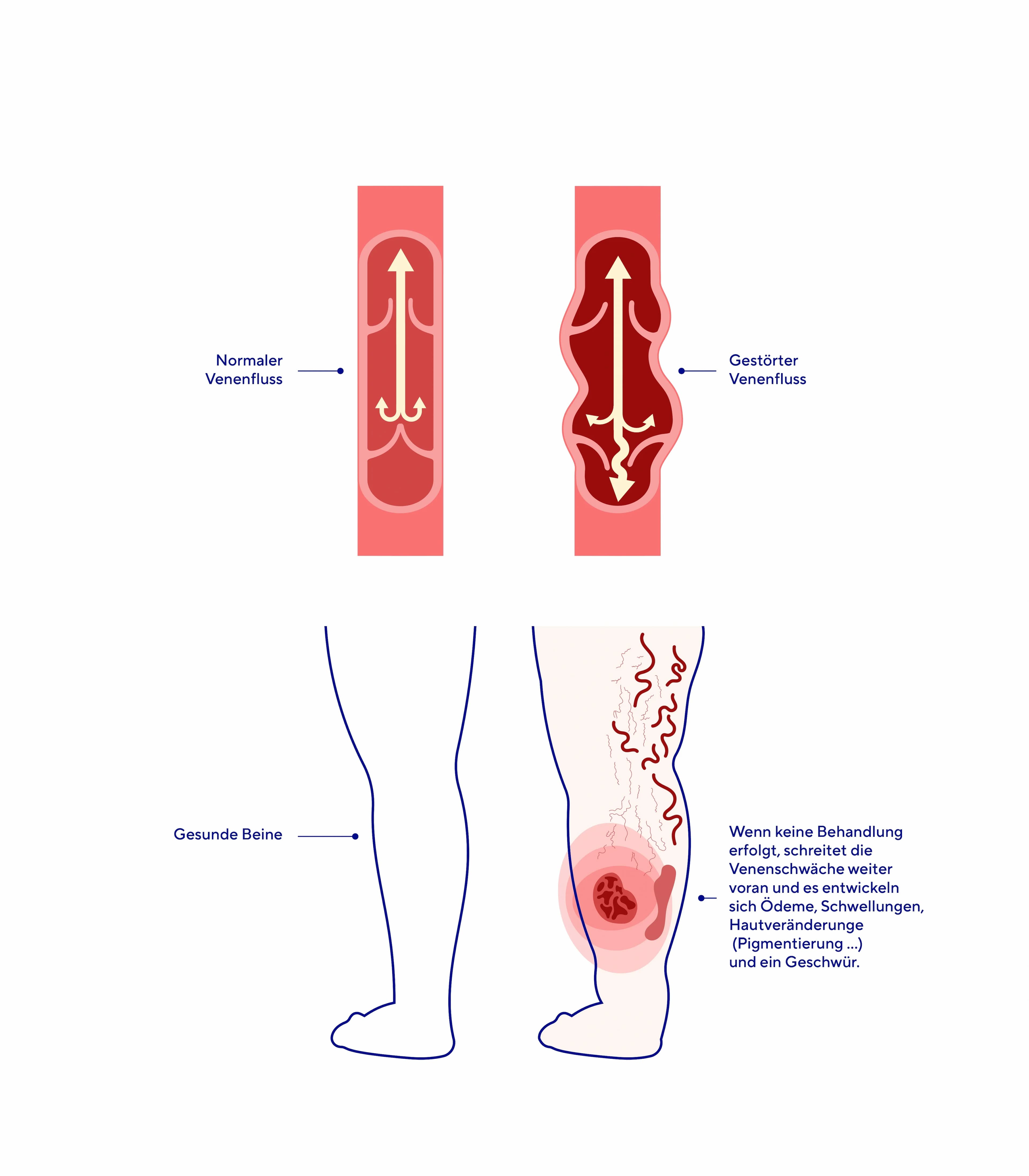 Das venöse Blut stagniert dann, wodurch der Druck in den Venen erhöht wird (venöse Hypertonie). Dieses Blut ist sauerstoffarm, sammelt sich unter der Haut an und verursacht venöse Ischämie und Hypoxie, was zu Ödemen, Entzündungen, Hautveränderungen und schließlich zu venösen Geschwüren führt(1,3).