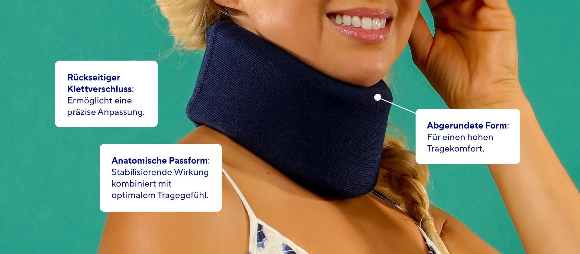 Dank ihrer anatomischen Form passt sich die weiche Schaumstoffstütze angenehm dem Hals an. Abgerundete Kanten, ein weicher, atmungsaktiver Überzug und die individuelle Anpassung per Klettverschluss sorgen für einen hohen Tragekomfort – auch bei längerem Tragen zu Hause, bei der Arbeit oder unterwegs.