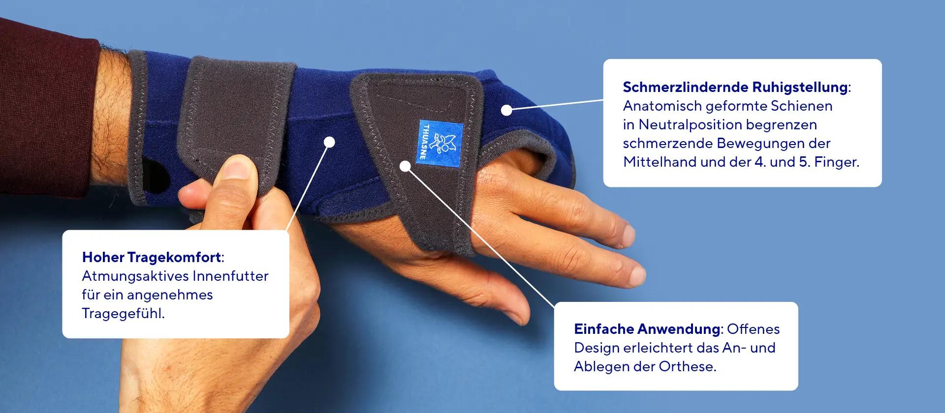 Die Orthese verfügt über eine starre, anatomisch geformte und anpassbare Palmarschiene und einen Abstandhalter, die die Bewegung der Hand und die Reibung zwischen den Fingern einschränken und sie dadurch immobilisieren und schützen.