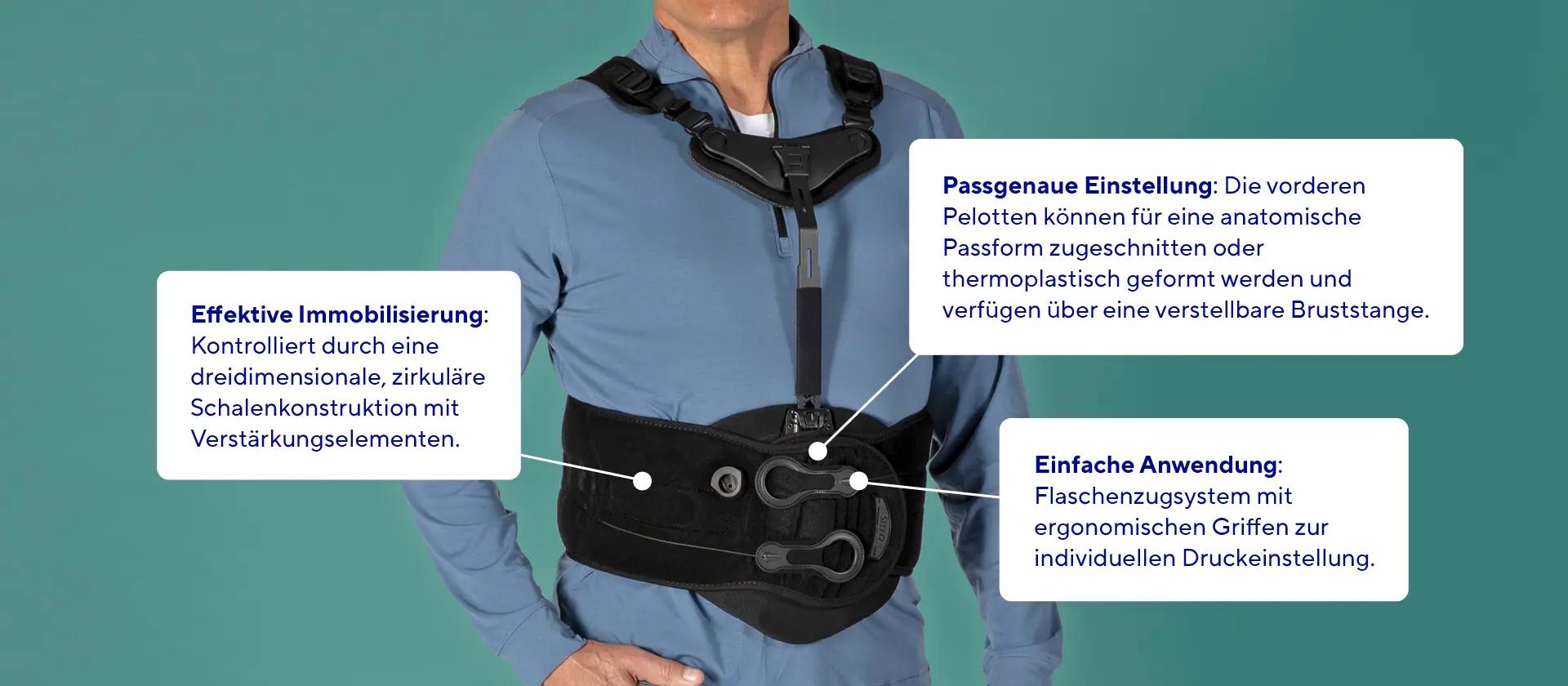 Die modularen Komponenten – darunter selbstformende, thermoplastisch anpassbare Schalen – machen eine individuelle Anpassung an die Anatomie und das Therapieziel des Patienten möglich. Das variable Gurtsystem erlaubt die Führung über die Schultern oder unter den Achseln, je nach Indikation und gewünschtem Tragekomfort.
