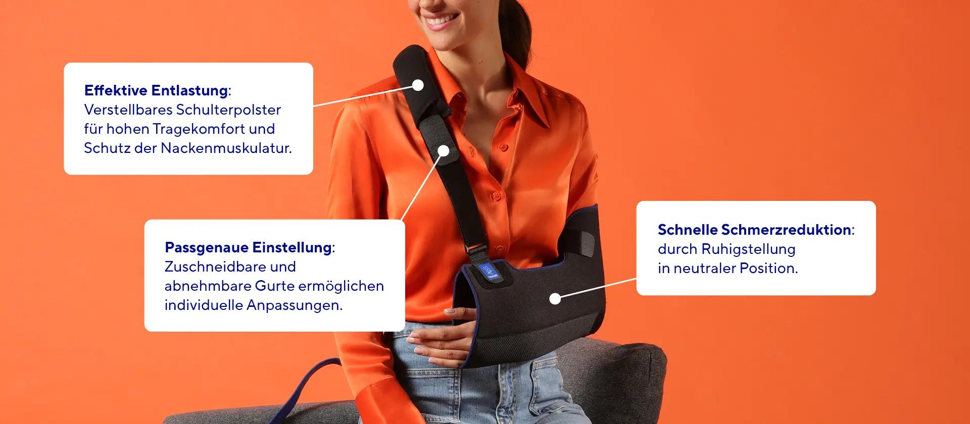 Dank des individuell verstellbaren Gurtsystems kann der Arm wahlweise unter der Brust oder in neutraler Position gehalten werden. Der weiche Armstrumpf schützt und stützt den Unterarm.