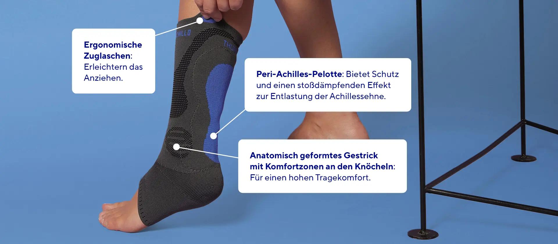 Das elastische Kompressionsgestrick fördert die Durchblutung, lindert Schwellungen und unterstützt die körpereigene Wahrnehmung der Sehnen- und Gelenkstellung (Propriozeption). Eine spezielle Silikoneinlage entlang der Achillessehne schützt vor Reibung und wirkt stoßdämpfend.