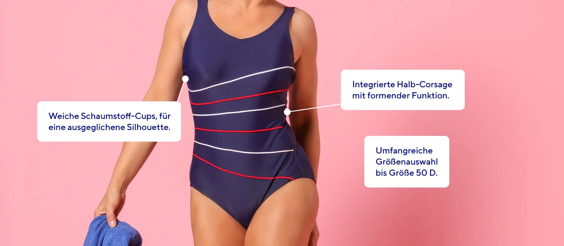 Der elegante Badeanzug ist bis zur Größe 50D erhältlich.