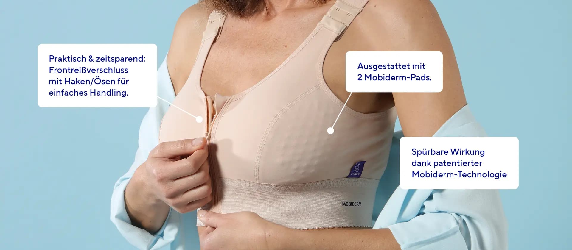 Dank seiner integrierten und individuell herausnehmbaren MOBIDERM®-Pads (2 Stück) übt er einen Druck auf die von Ödemen betroffenen Gewebebereiche aus. Dadurch wird die Lymphdrainage deutlich verbessert. Zusätzlich wird durch die kontrollierte Kompression im Bereich des Narbengewebes die Entstehung von Hämatomen minimiert.