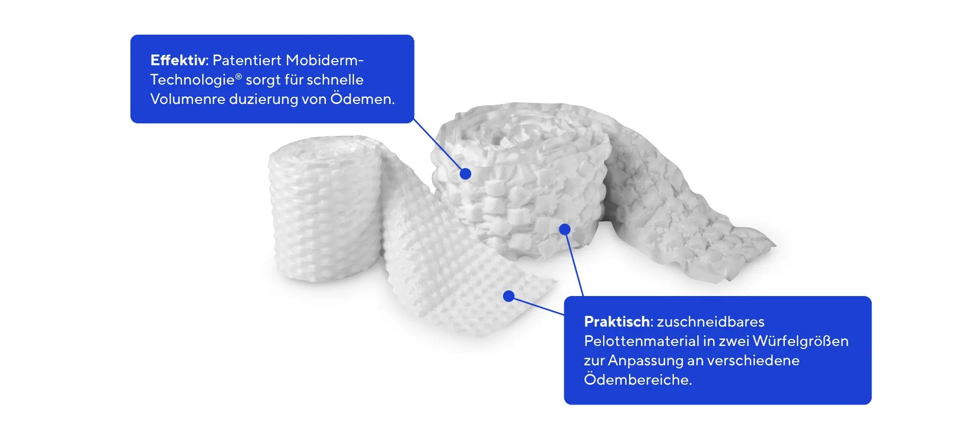 Mobiderm® Mobilisierungsbinden werden unter einem Reduzierverband zur Mobilisierung von ödematösem oder induriertem subkutanem Gewebe verwendet1,2.