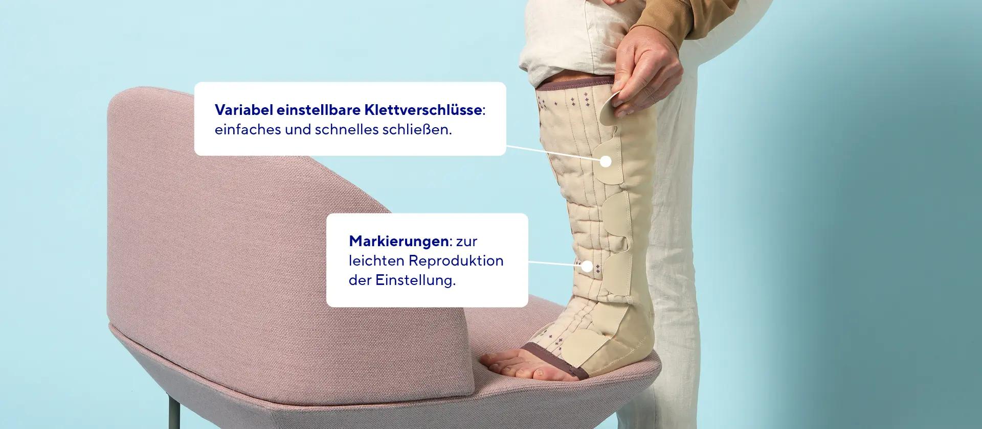 Dies gewährleistet eine bequeme und angepasste Passform, die bei Bedarf leicht geändert werden kann. Das Kleidungsstück kann genau an die Beinform des Patienten angepasst werden und bietet Kompression und Unterstützung.