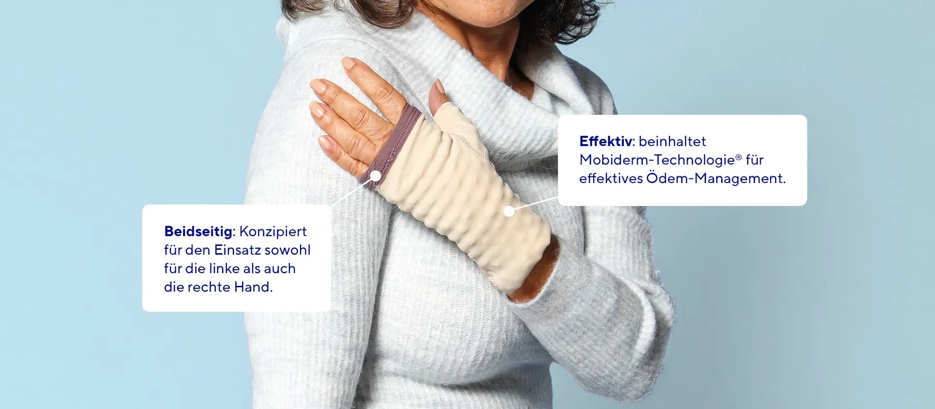 Mobiderm® Handschuh ohne Finger ist ein mobilisierender Fäustling zur Behandlung von leichten bis mittelschweren Lymphödemen.