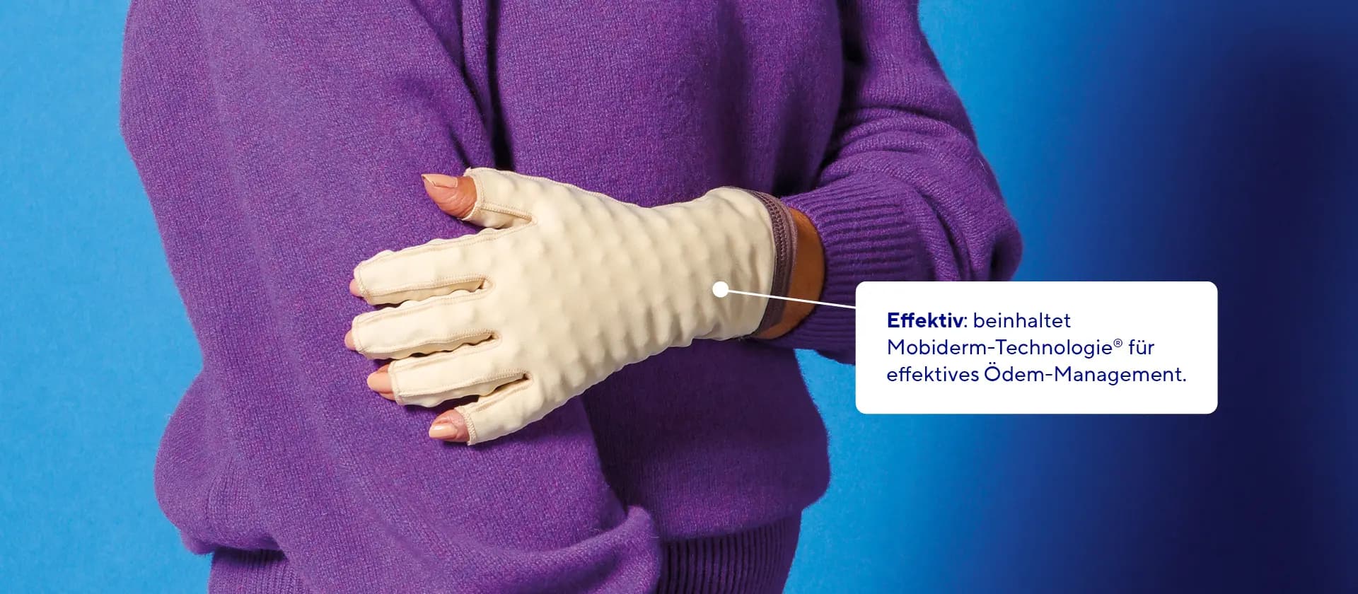 Der Mobiderm® Standard Handschuh ist ein mobilisierender Handschuh für die Behandlung von leichten bis mittelschweren Lymphödemen an den Händen.