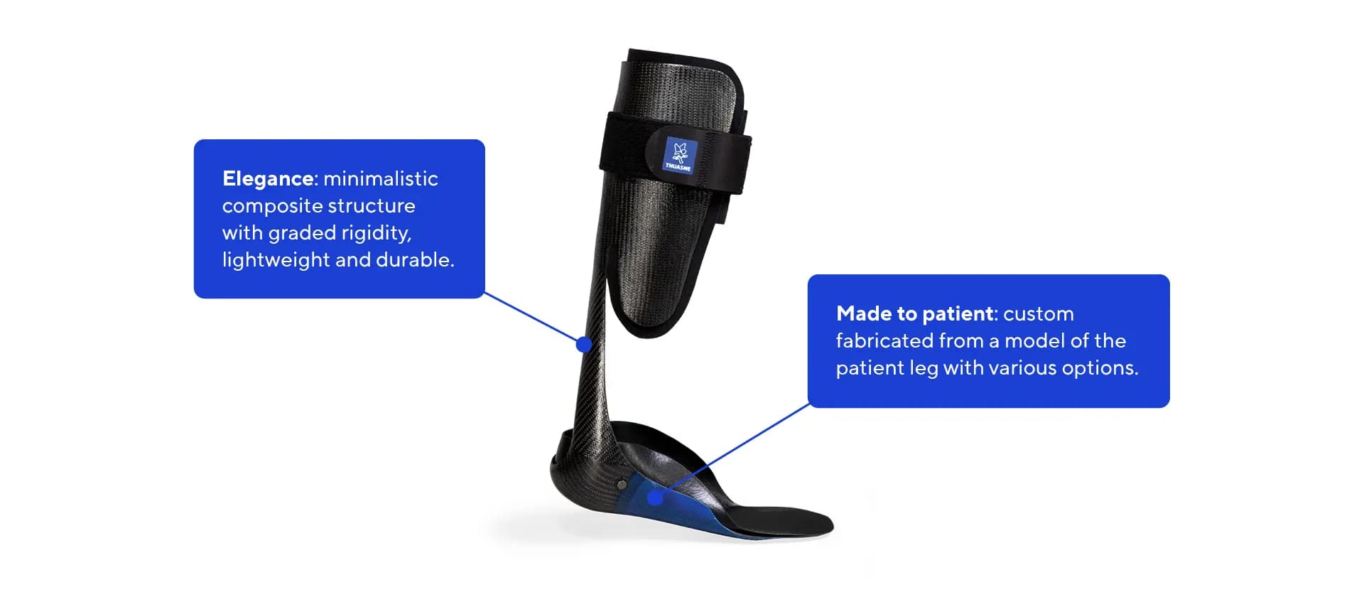 SpryStep® AFO Custom is engineered to provide support and stability for individuals experiencing lower limb muscle weakness due to neurological, traumatic, or muscular origins. This orthosis is custom-fabricated from a digital scan of the patient’s leg, ensuring a precise and comfortable fit. The use of advanced composite materials guarantees both strength and lightness, which is crucial for prolonged use1 and patient compliance.