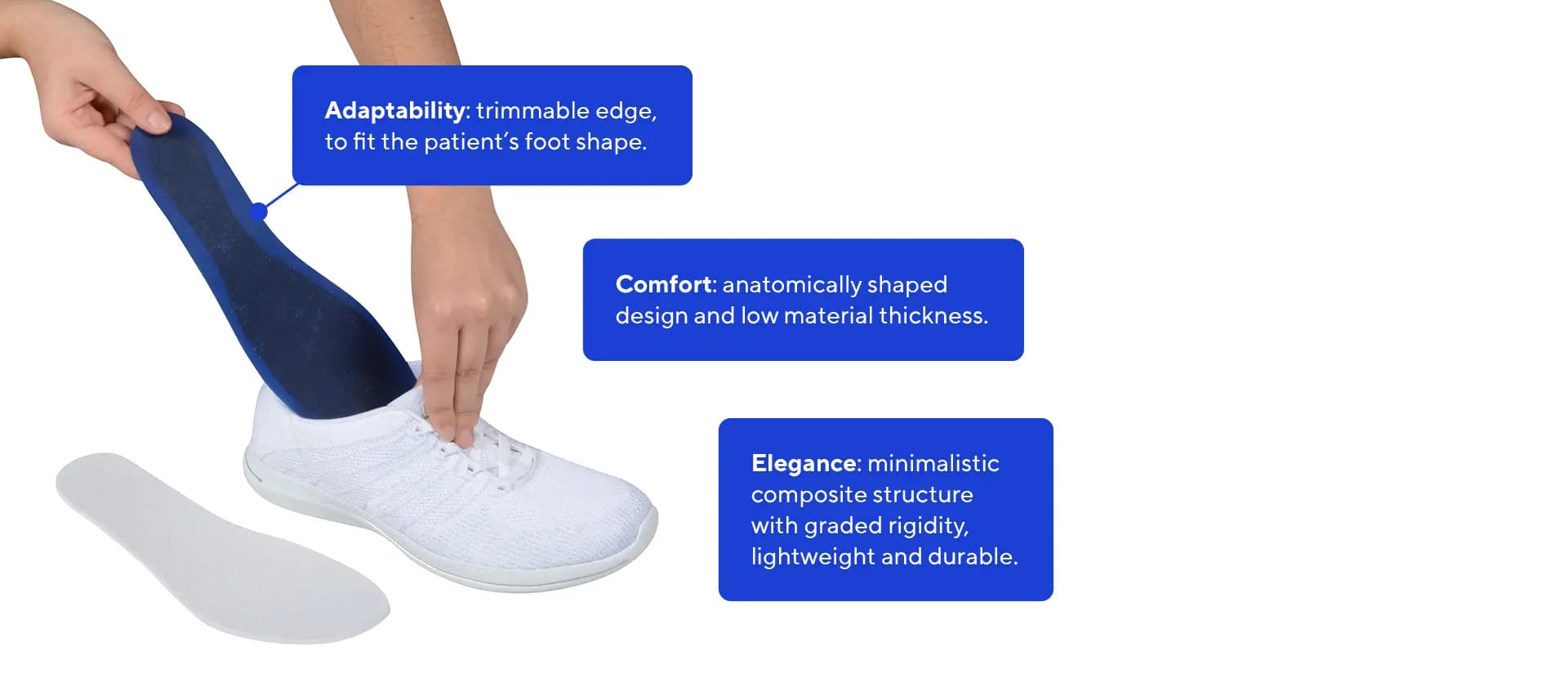 Versatile solution for conditions such as idiopathic toe walking, metatarsophalangeal joint (MTPJ) osteoarthritis, midfoot osteoarthritis, and Morton’s neuroma when used with a soft insole.