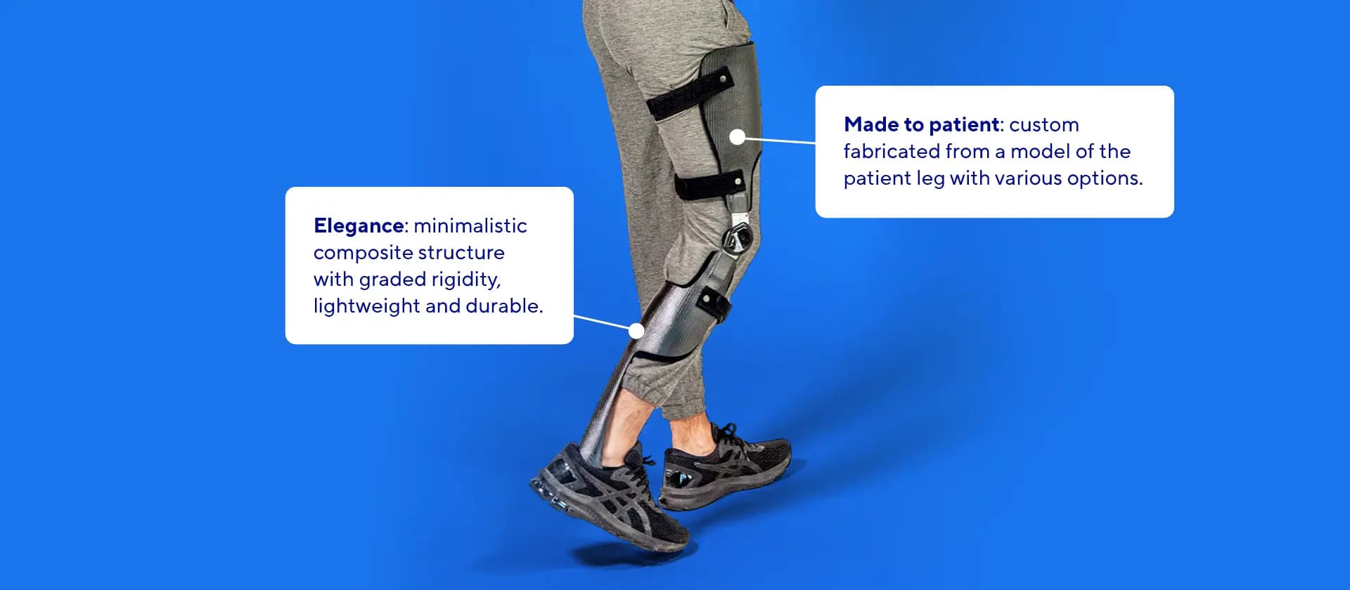 This orthosis is custom-made from a digital scan of the patient's leg, ensuring a precise fit that enhances both comfort and effectiveness.