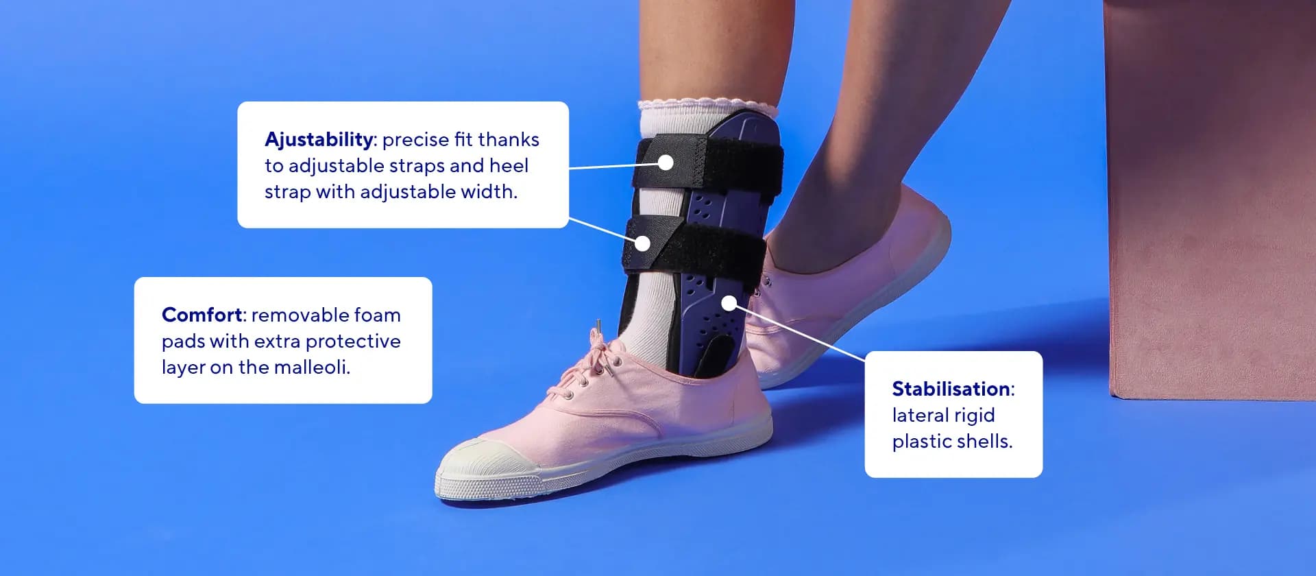 They feature rigid plastic shells to help support the joint, removable foam pads with a layer of protection over the malleoli to improve comfort and provide protection, adjustable straps and a width-adjustable heel cup to ensure a precise fit for the patient.