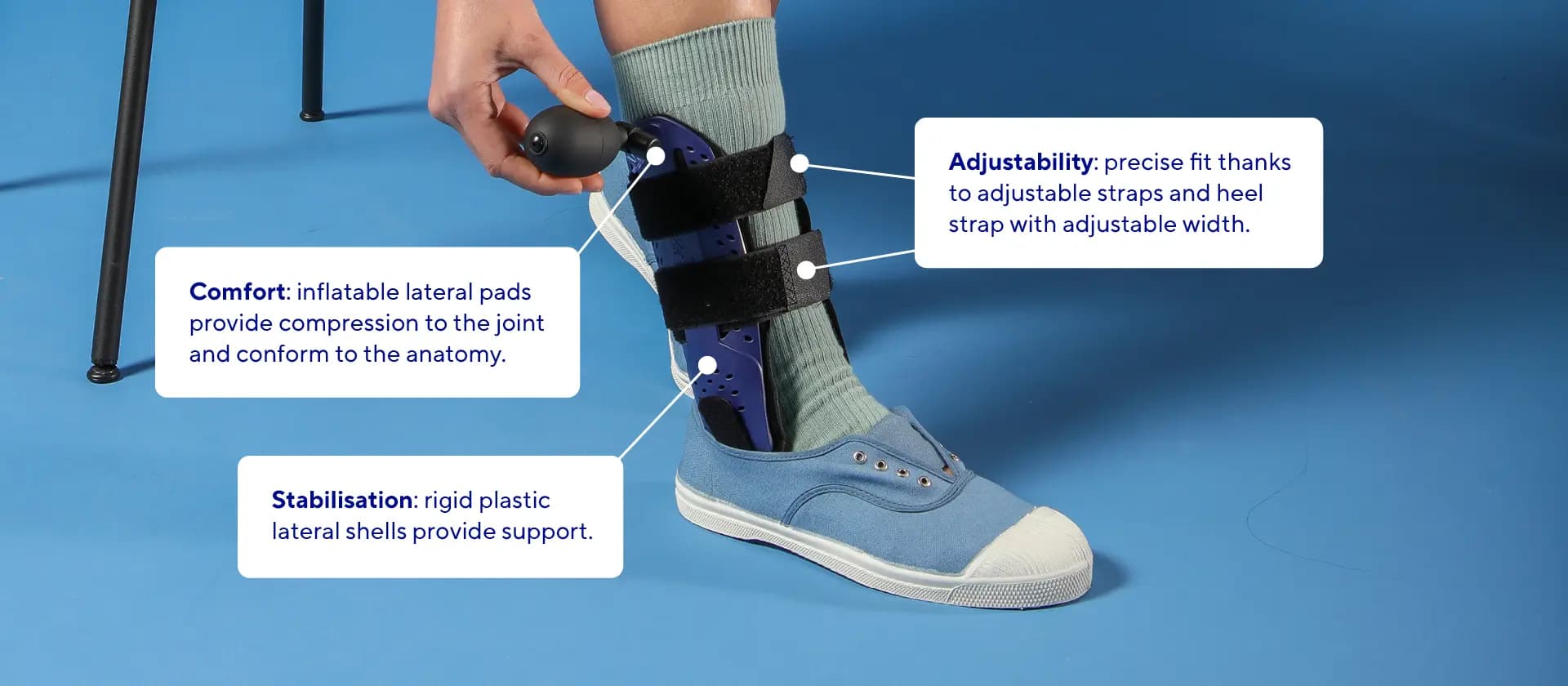 They feature rigid plastic shells to support the joint, removable foam pads with a layer of protection over the malleoli to improve comfort and provide protection, adjustable straps and a width-adjustable heel cup to ensure a precise fit for the patient.