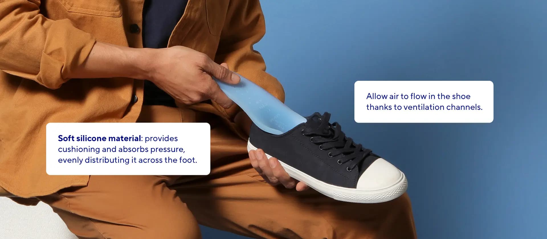 These insoles are made from soft silicone material, ensuring even distribution of pressur and shock absorption.