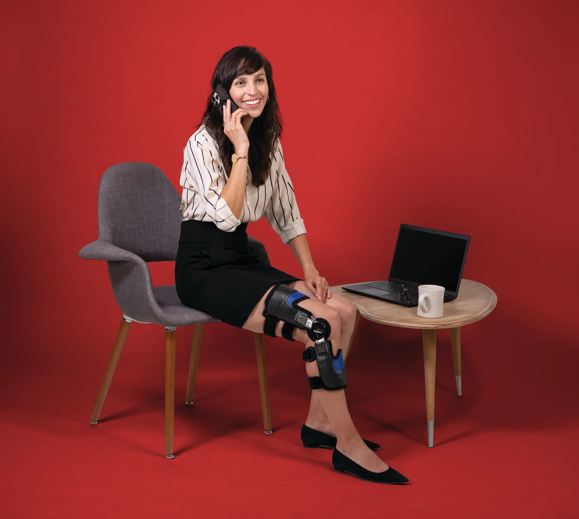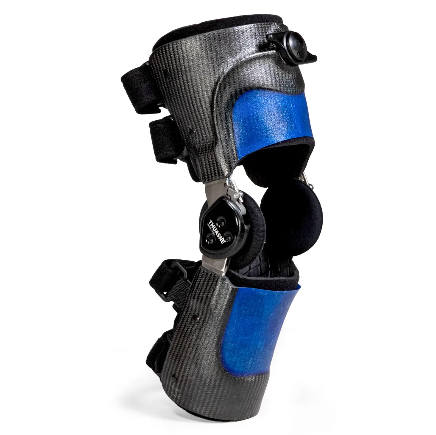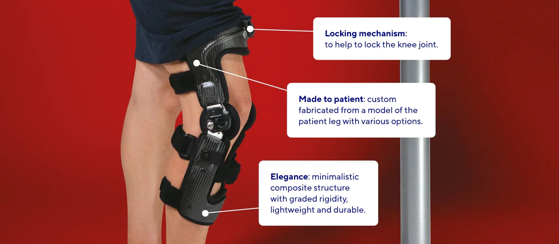 This knee orthosis is custom-made from a digital scan of the patient's leg, ensuring a precise fit that enhances both comfort and effectiveness.