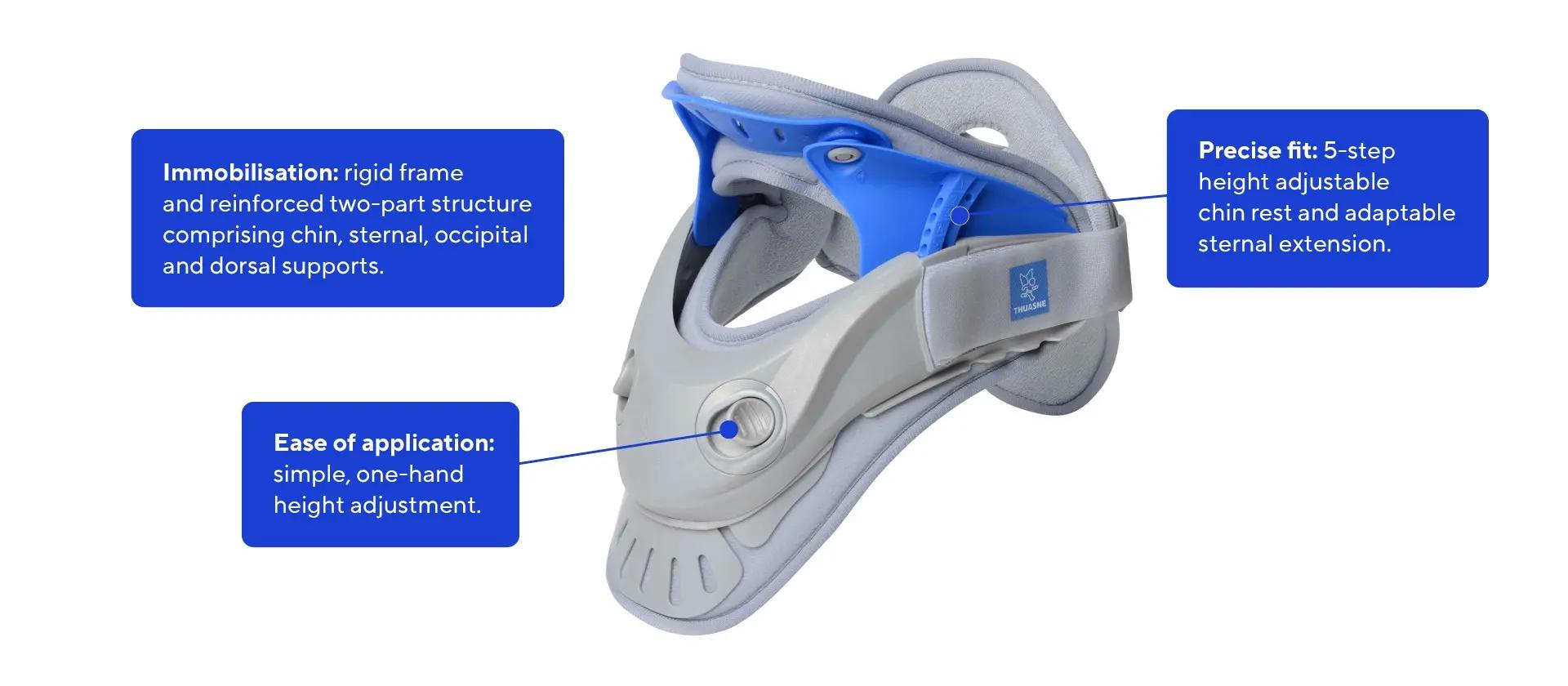 This collar is designed for patients who require significant neck immobilisation due to traumatic, inflammatory and/or degenerative conditions, or pre/post-operatively.