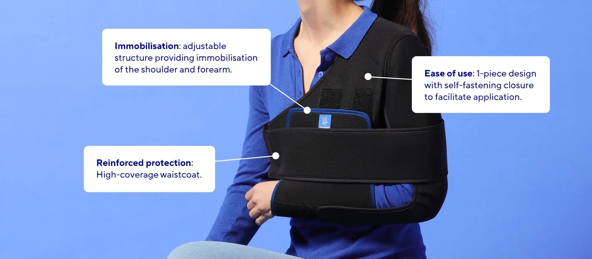 ImmoVest is a shoulder immobilisation vest designed to support and immobilise the shoulder and elbow. The wraparound and anatomical design provide a reinforce protection.