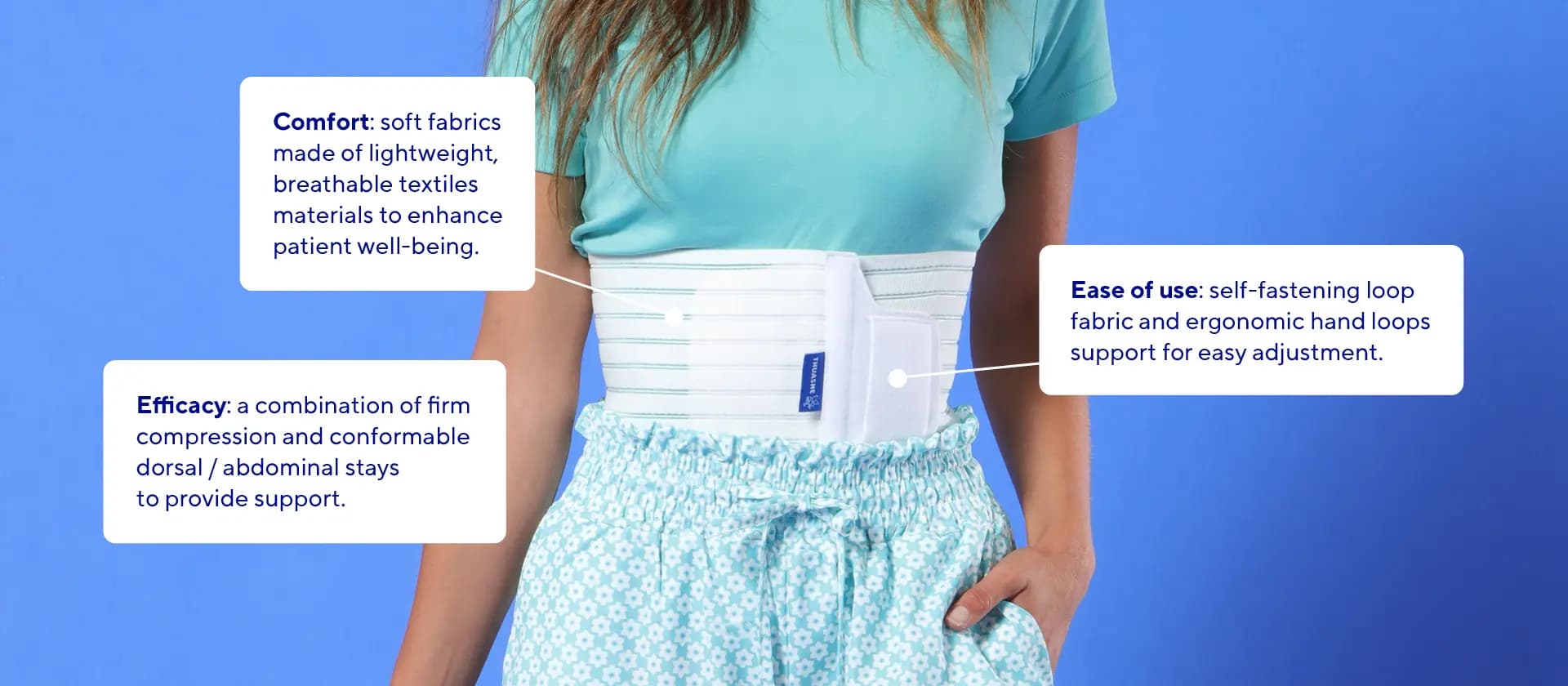 Dynabelt is designed to support abdominal muscle weakness, post-operative recovery after laparotomy or laparoscopy, post-partum care (including after caesarean section) and orthostatic hypotension. Its short-stretch elastic fabric provides firm compression, while rigid and flexible stays - both dorsal and abdominal - offer stability and freedom of movement. A removable hypogastric strap provides additional targeted compression if required.