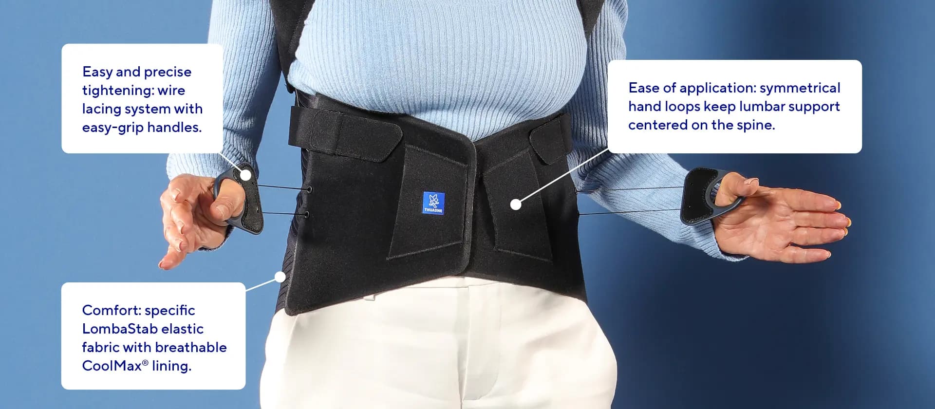 LombaStab Dorso is a thoraco-lumbar support belt designed to alleviate low back pain and support your spine. This device uses a combination of a comfortable metal back frame, adjustable straps, and a removable sternum support to maintain spinal hyperextension. It features an easy wire lacing system with easy-grip handles, ensuring precise tightening and a snug fit1,3,4.
