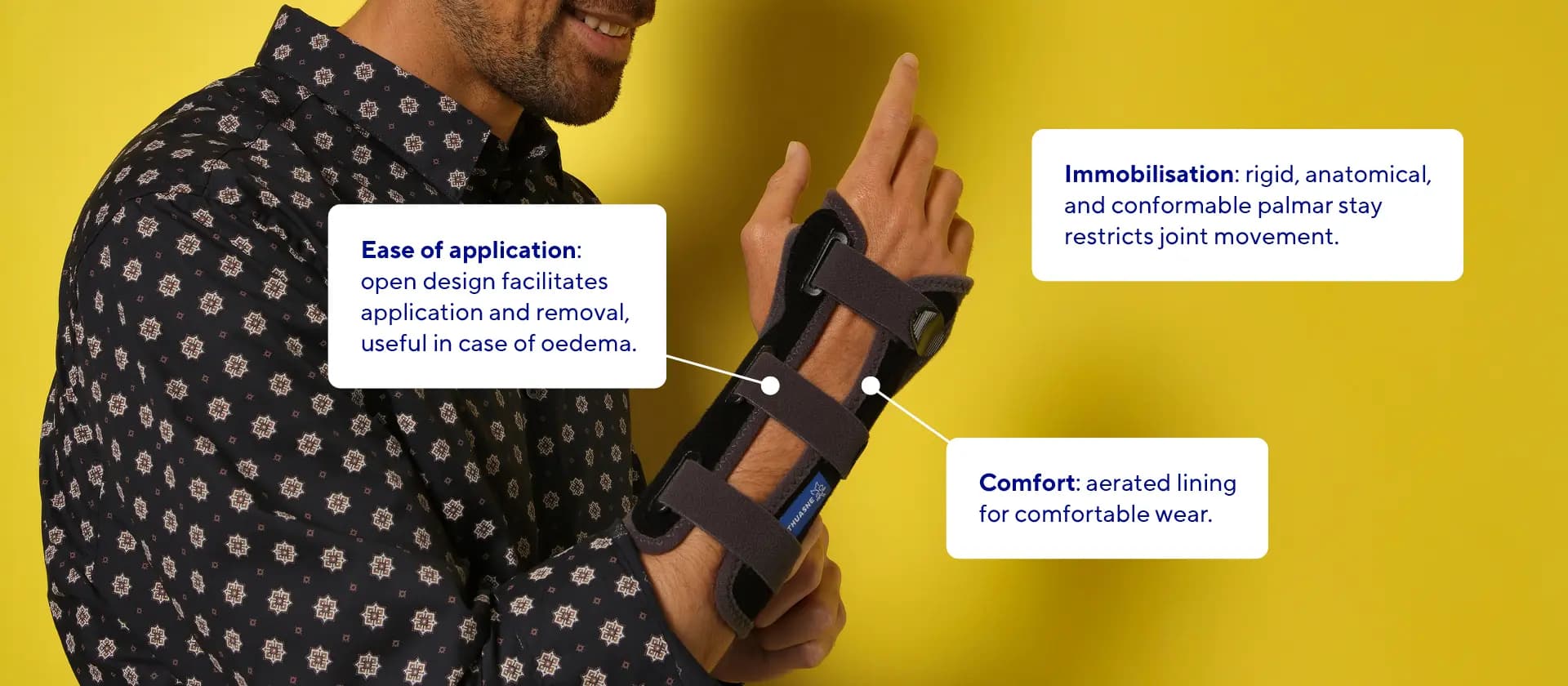 It is designed to immobilize the wrist by means of rigid, anatomical and conformable palmar and dorsal stays that limit joint movements and are easy to apply thanks to its open design that facilitates placement and removal while being useful in case of edema.