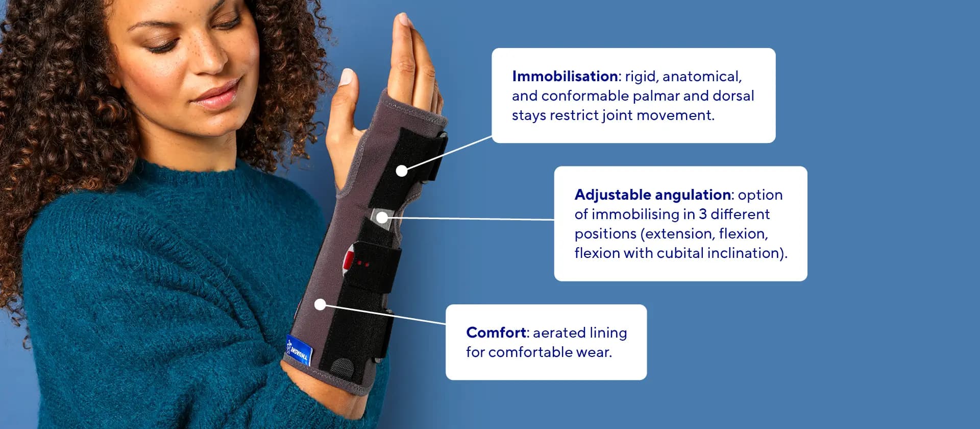 It is designed to immobilize the wrist by means of rigid, anatomical and conformable palmar and dorsal stays that limit joint movements and be easy to apply with numbered and visual markings on the straps.