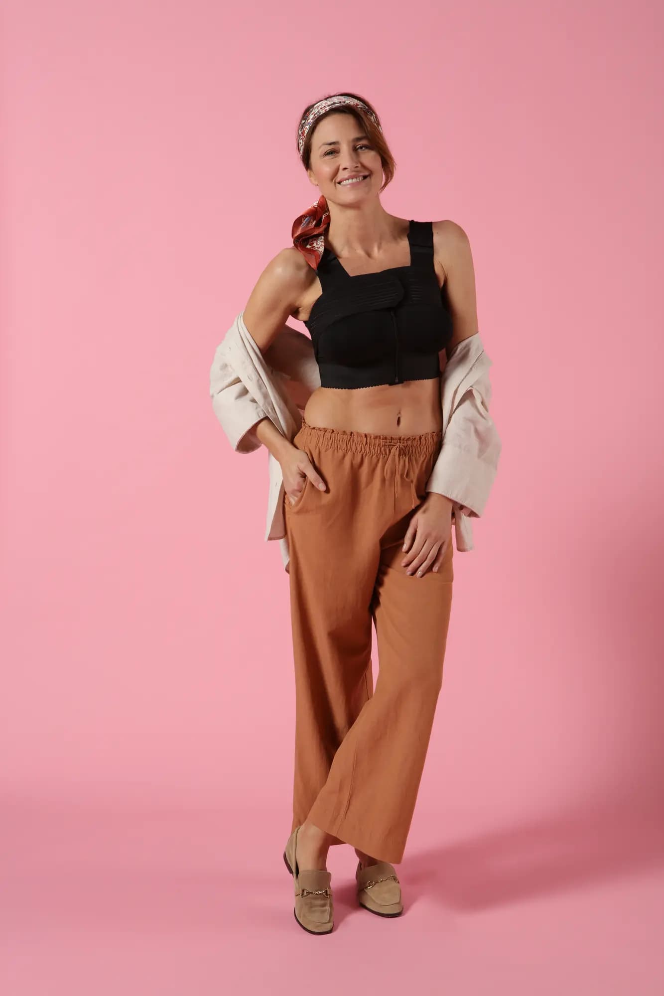 Compression bra designed for lymphatic drainage and reduction of oedema in the breast and chest wall after breast cancer surgery.
