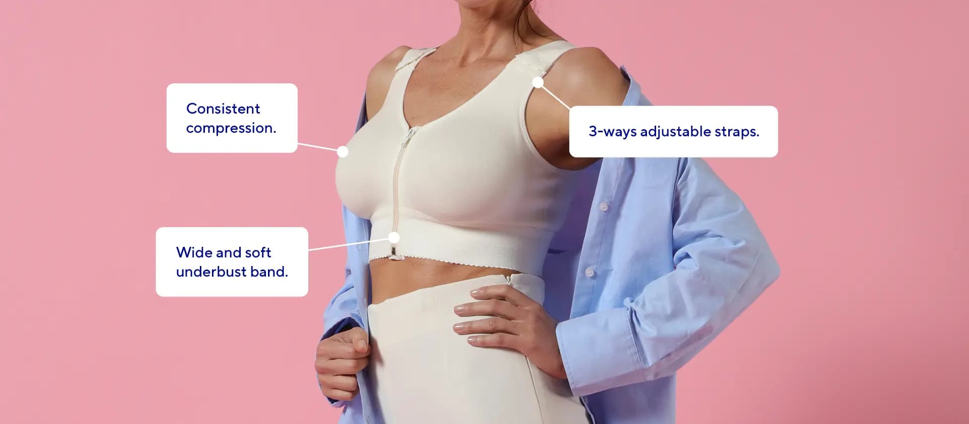 Cara is a compression bra for after plastic surgery or breast-conserving surgery (BCS).