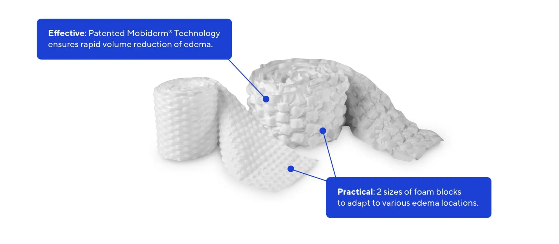 The patented Mobiderm® Technology3 used under a compression bandage provides a pressure differential between the contact area beneath the blocks and their periphery, creating multi-directional circulation channels for the lymph under the skin.