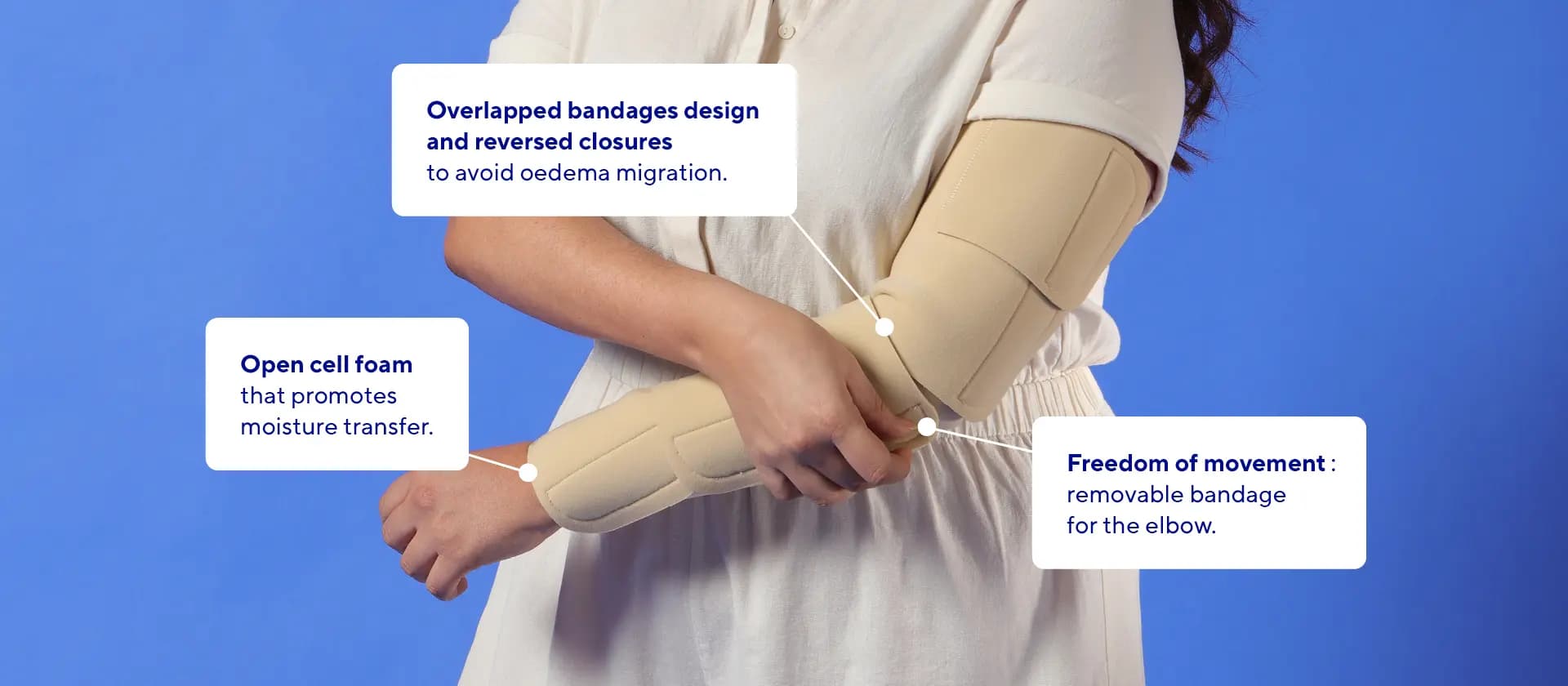 The overlapping strap design ensures complete coverage of the limb, preventing oedema migration and providing uniform compression across the entire arm.
