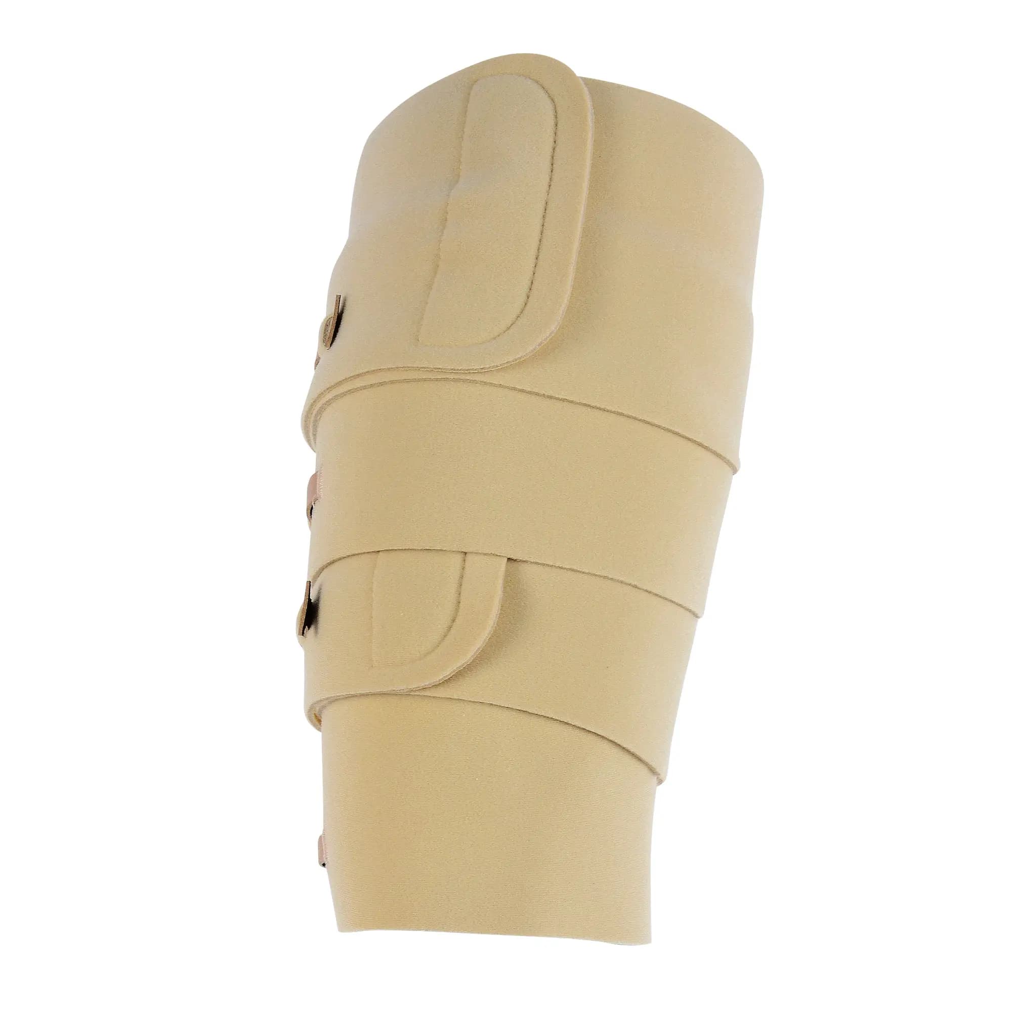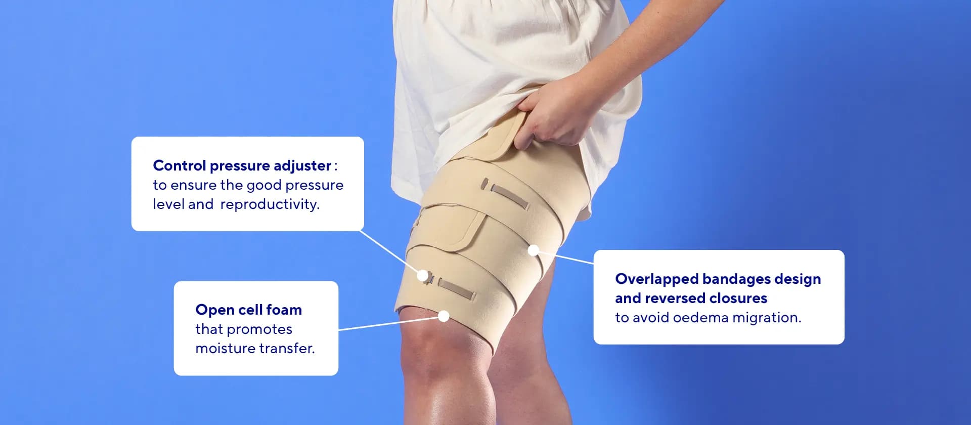 This device covers the entire thigh with overlapping bandages and reversed closures, preventing the migration of oedema and ensuring comprehensive coverage.