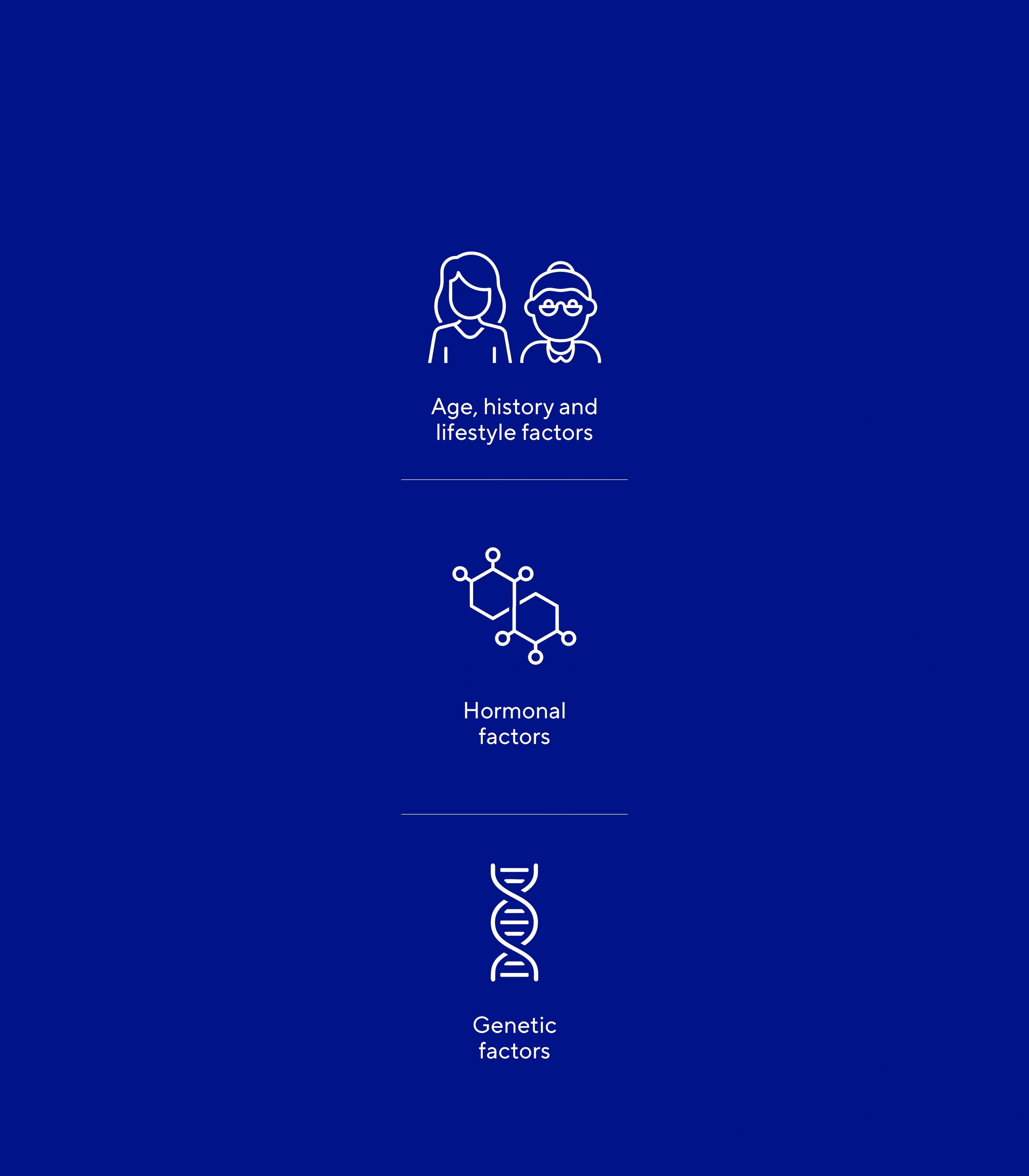 Prolonged exposure to hormones, whether as a result of early puberty, late menopause, late first pregnancy, lack of breastfeeding, or prolonged use of hormonal therapies such as the oestroprogestogenic pill, increases the risk of breast cancer(3,5).
