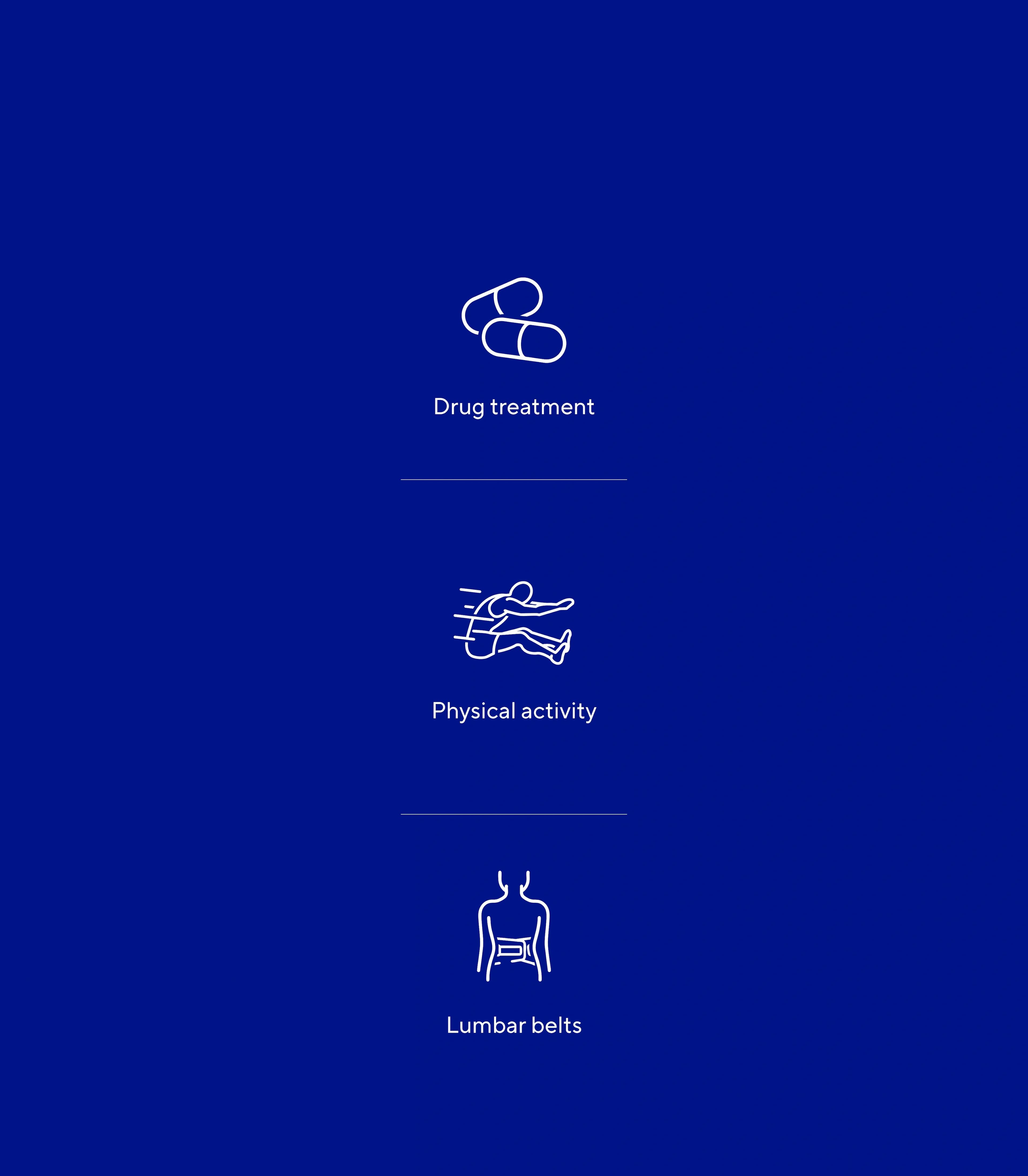 If the symptoms of low back pain are unbearable, the doctor treating the patient may prescribe painkillers or anti-inflammatories, the aim being to relieve the pain so that the patient can maintain physical activity and keep moving.