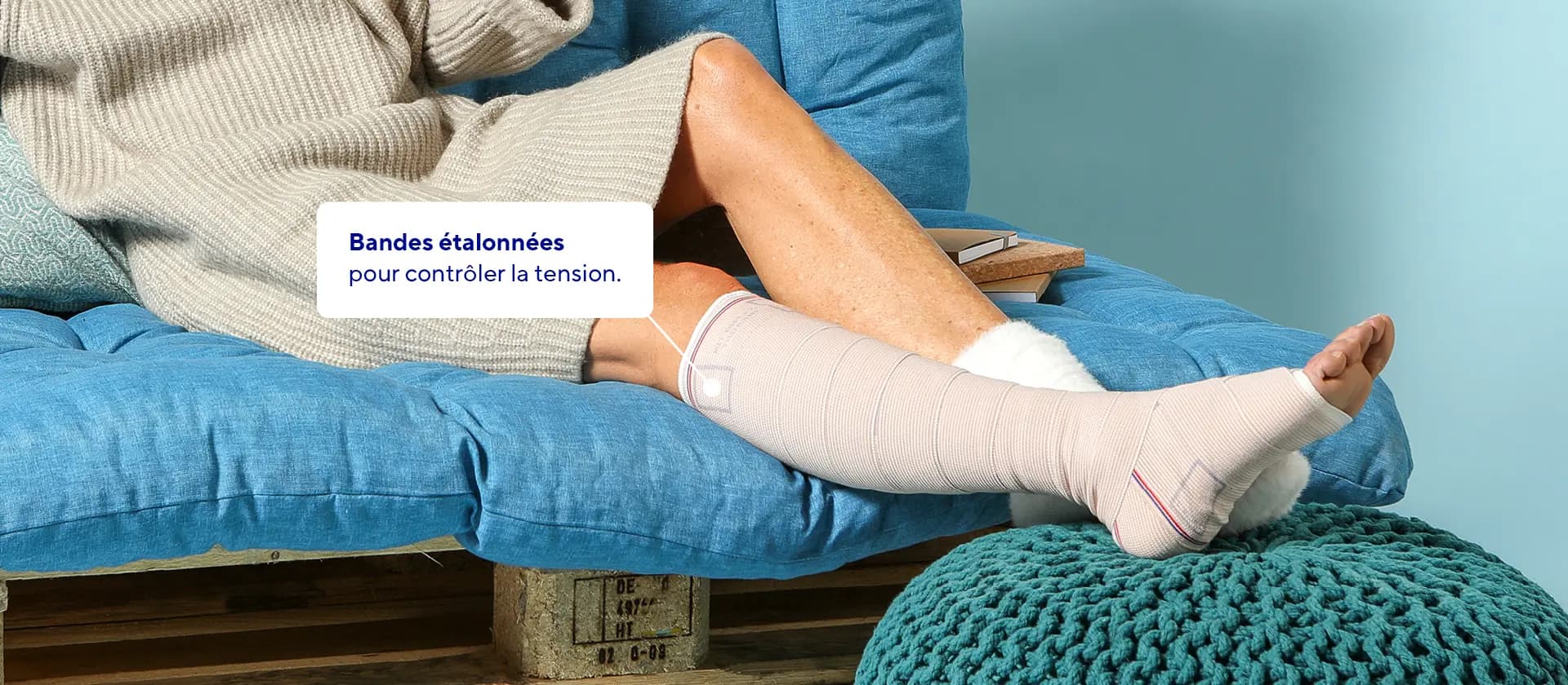 Ce kit contient deux bandes à allongement court, qui assurent le bon niveau de pression donc l'efficacité du traitement6,7.