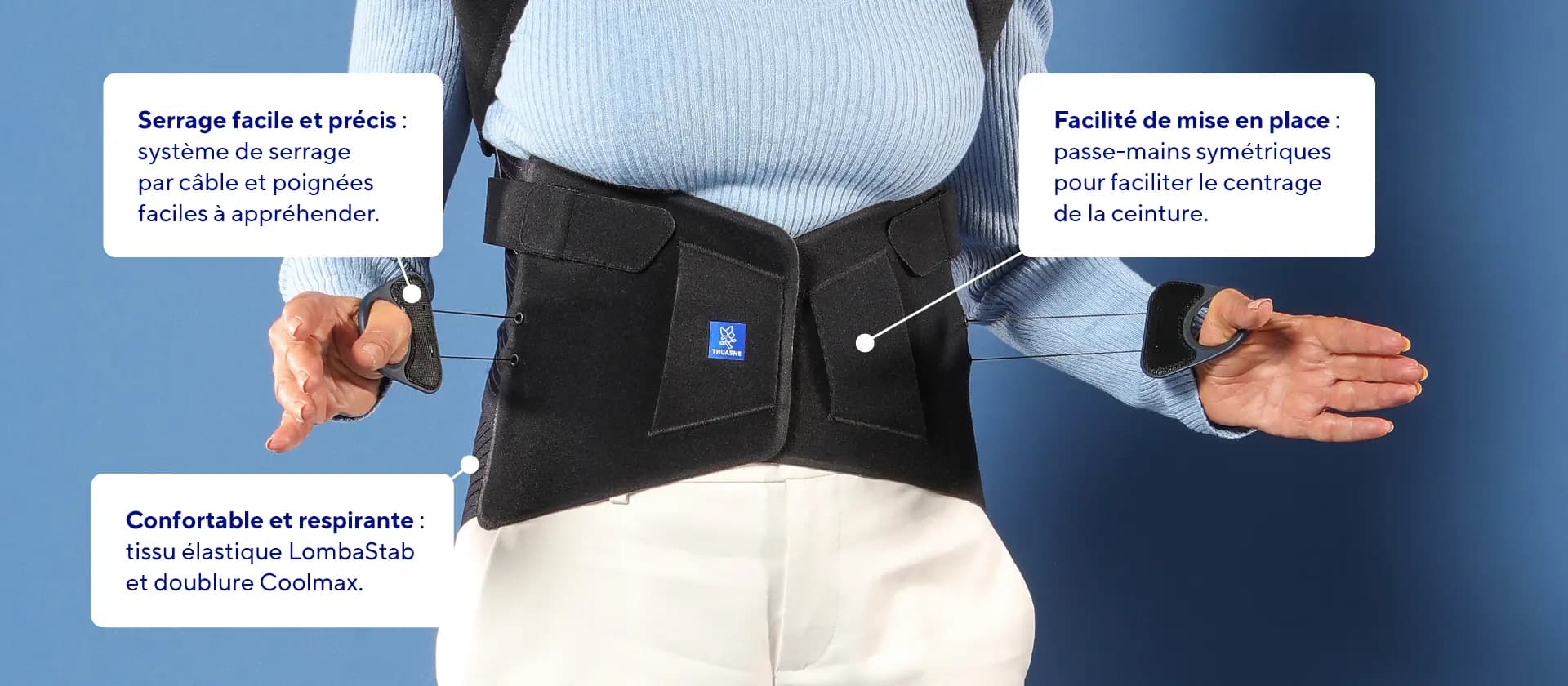 La ceinture LombaStab est conçue pour une utilisation prolongée grâce à son tissu respirant et sa doublure Coolmax2. La forme des bretelles libère les aisselles et évite les frottements sous les bras, rendant le port confortable.