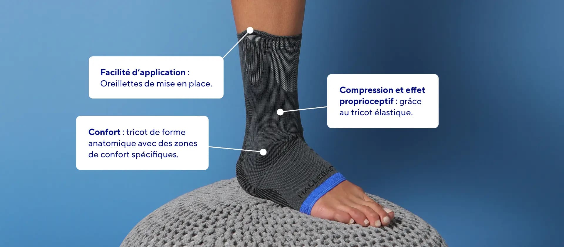 L'orthèse de cheville MalleoAction est conçue pour soutenir les personnes souffrant d'entorses légères à la cheville.