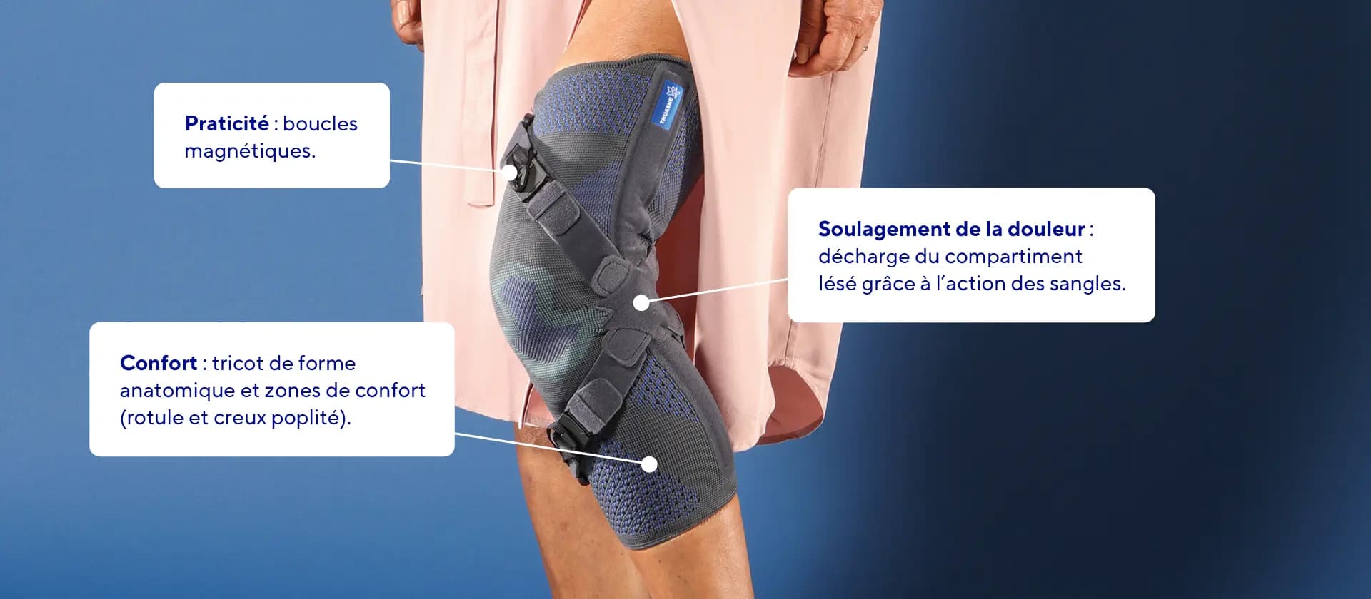 Elle fonctionne en soulageant la partie douloureuse du genou grâce à un système de sangles inélastiques qui réduisent la pression lorsque la jambe est tendue. Son efficacité a été prouvée par des études cliniques1. De plus, le tricot élastique permet une compression homogène et un effet proprioceptif.