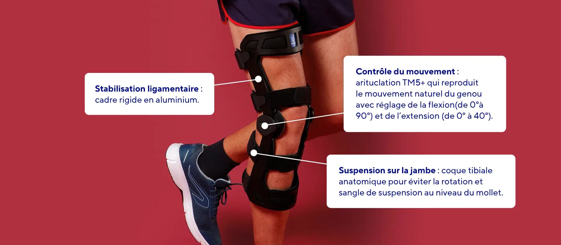 Cette orthèse assure une stabilisation des ligaments. L'armature rigide en aluminium, la coque tibiale antérieure et l'articulation TM5+1 permettent une prévention des mouvements anormaux de translation et rotation du tibia.