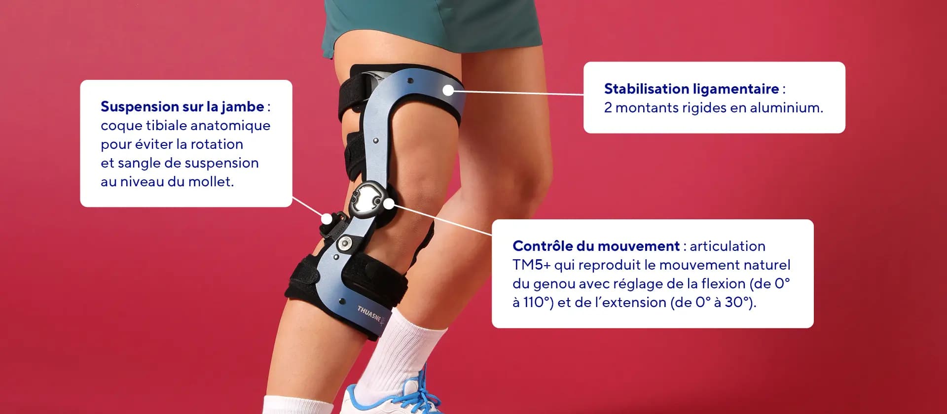 Grâce à son armature rigide en aluminium, à sa coque tibiale anatomique et à son articulation TM5+1, elle reproduit le mouvement naturel du genou et assure une stabilisation des ligaments. La sangle de suspension placée au-dessus du mollet et la forme anatomique de la coque tibiale limitent la rotation de l’orthèse et favorisent la tenue.