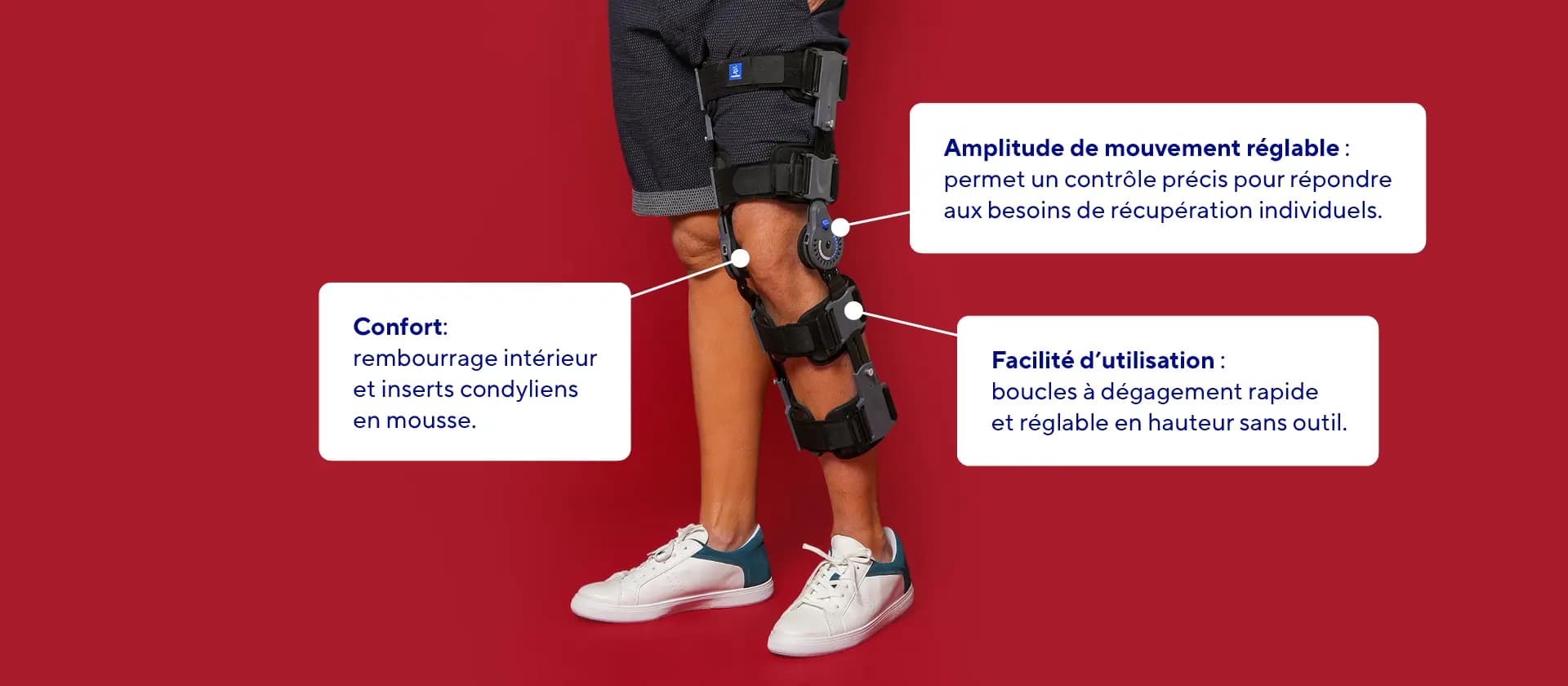 - L'orthèse apporte un soutien en immobilisant l'articulation du genou et en permettant un mouvement contrôlé, ce qui favorise la guérison et prévient d'autres blessures.