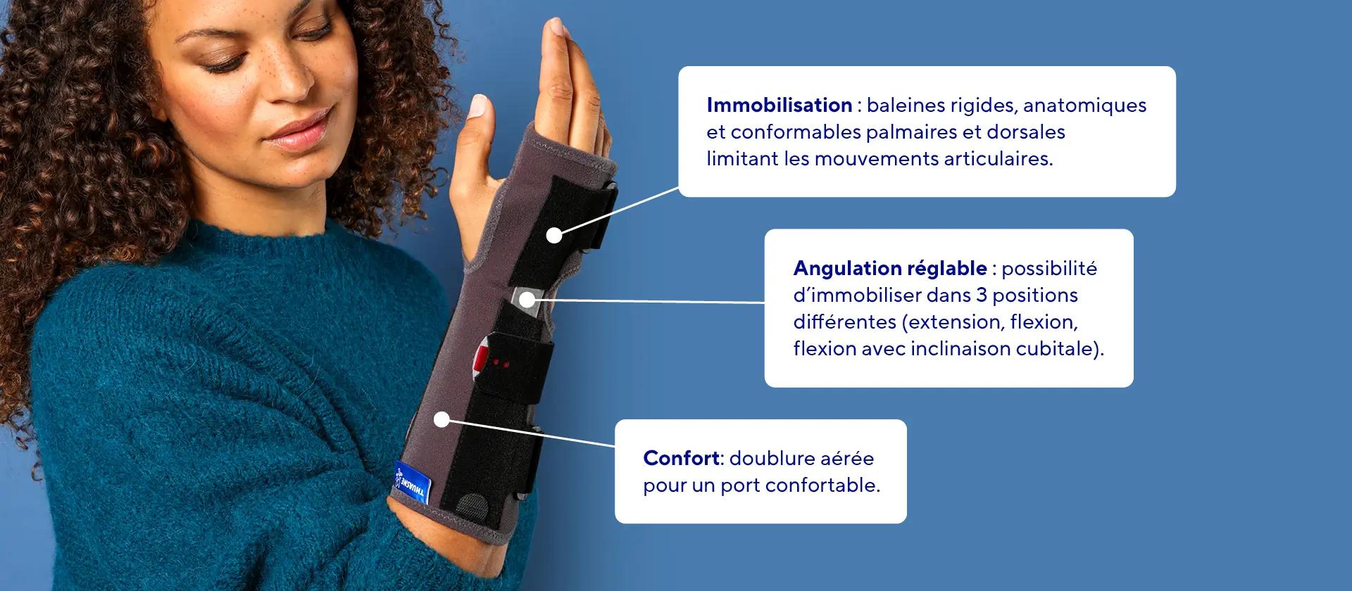 Elle est conçue pour immobiliser le poignet au moyen de baleines palmaires et dorsales rigides, anatomiques et conformables qui limitent les mouvements articulaires et sont faciles à mettre en place grâce à des repères numérotés et visuels sur les sangles.