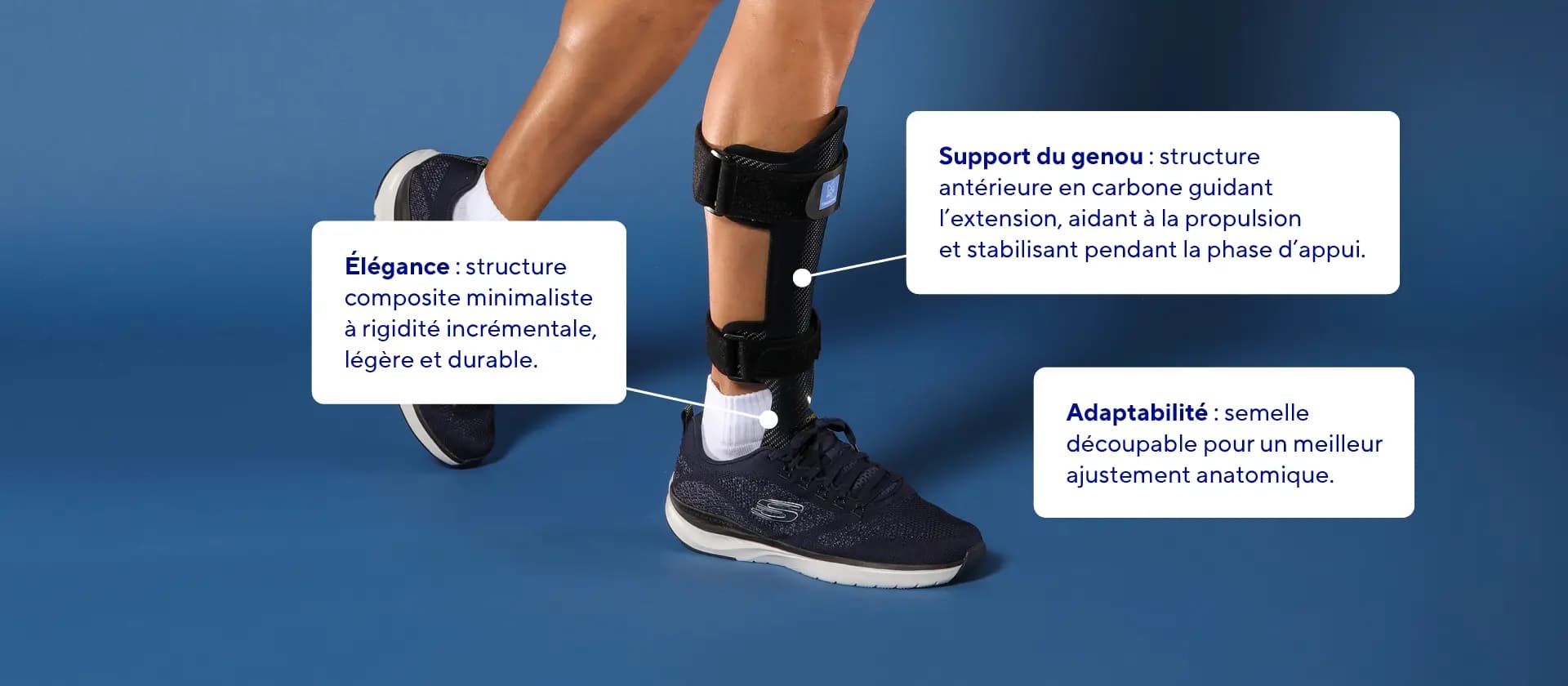 Cette orthèse est conçue pour fournir une stabilisation et un soutien pendant la phase d'appui de la marche, répondant ainsi à divers défis biomécaniques.