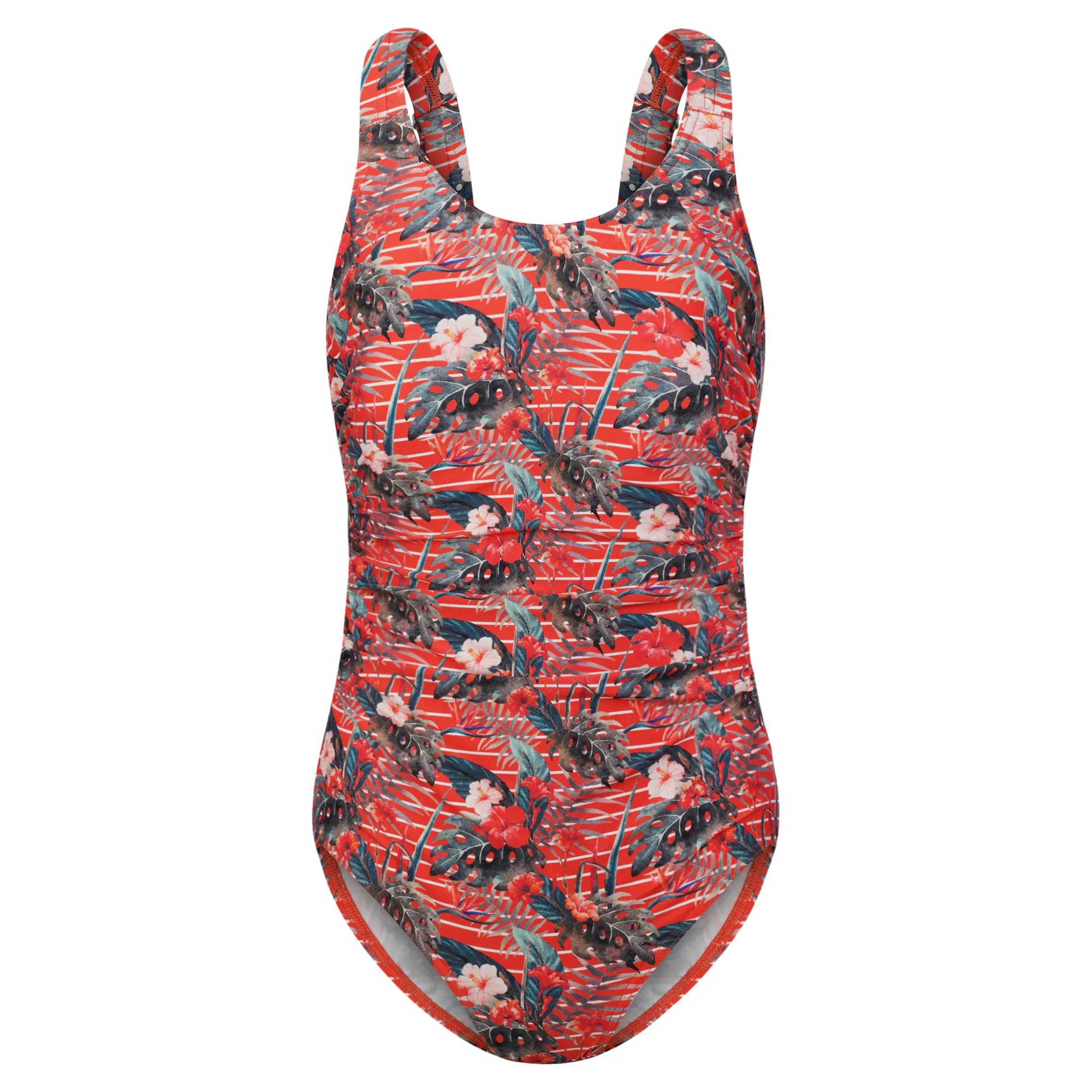 Ce maillot de bain à imprimé floral rouge et vert est complété par des rayures blanches.