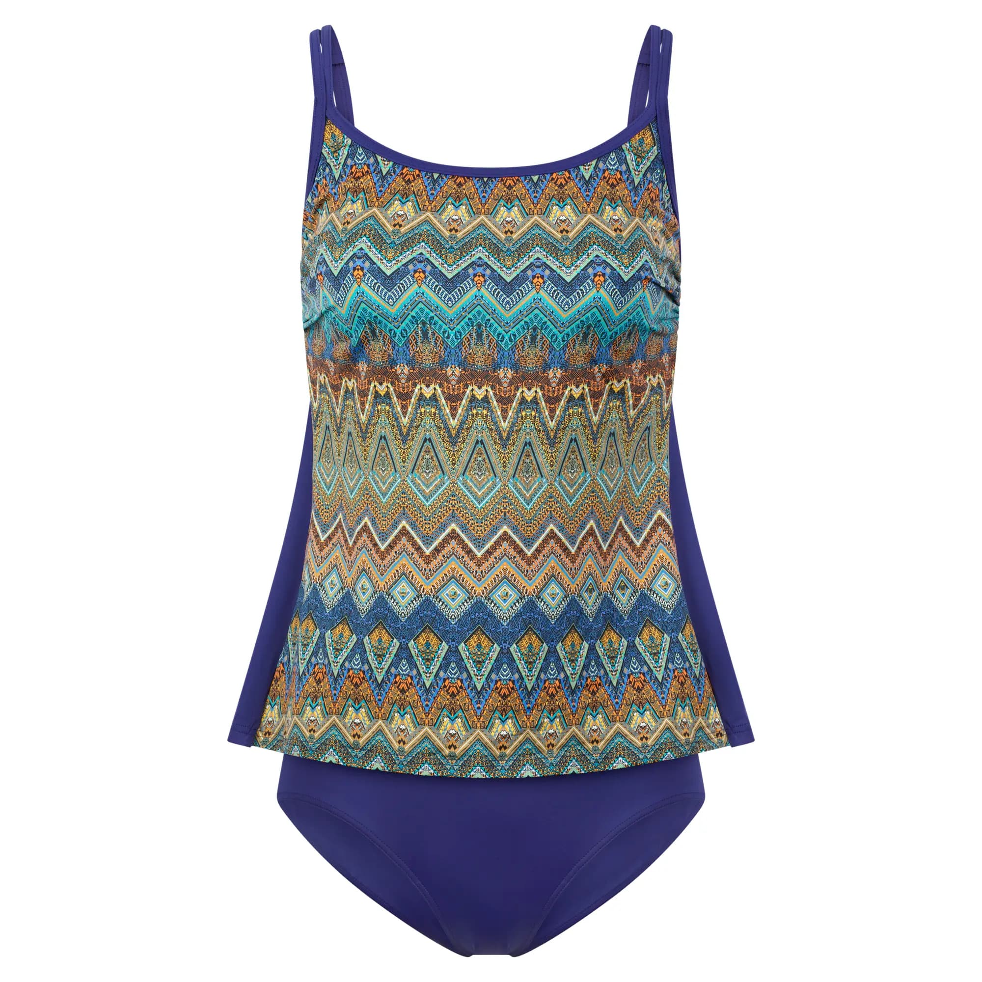 Le haut de Tankini BARBADOS est imprimé sur l'avant du maillot de bain, dans des coloris pétrole, bleu, orange et jaune. Le dos du haut de Tankini est entièrement bleu foncé.
