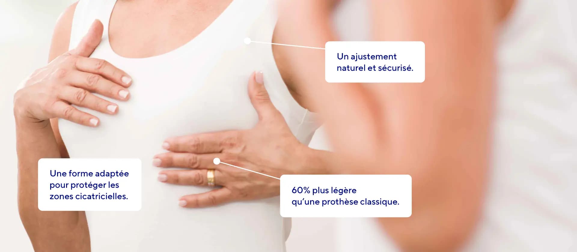 La prothèse mammaire externe Silima® ULTRA LIGHT a une forme symétrique et anatomique épouse l'ensemble du sein dans sa globalité, notamment le bas du sein.