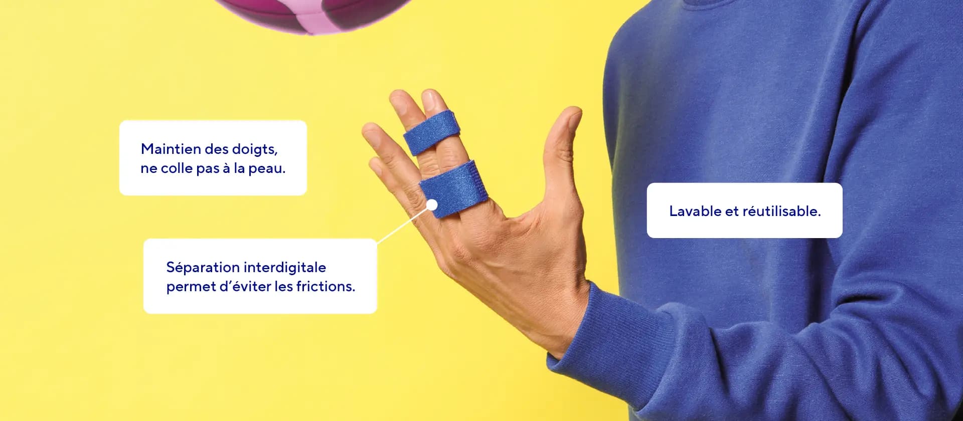 Immobiliser le doigt atteint avec le doigt adjacent le moins gênant pour les gestes du quotidien. Fixer les bandes sur les phalanges, éviter les articulations pour conserver leur mobilité. Il est possible de découper les bandes pour adapter leur hauteur. Vérifiez que la flexion et l’extension des doigts est conservée et que les bandes ne sont pas trop serrées pour la circulation sanguine.