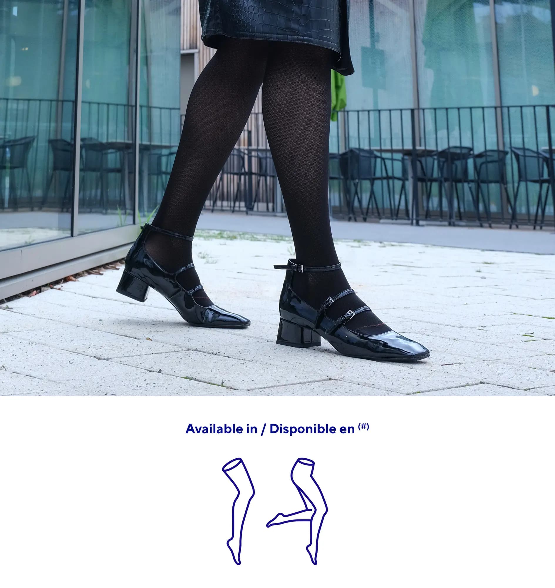 - La densité moyenne de la maille associée à des fils plats (lisses) et brillants pour une finition semi-transparente, permet de mettre en valeur les jambes notamment à la mi-saison.